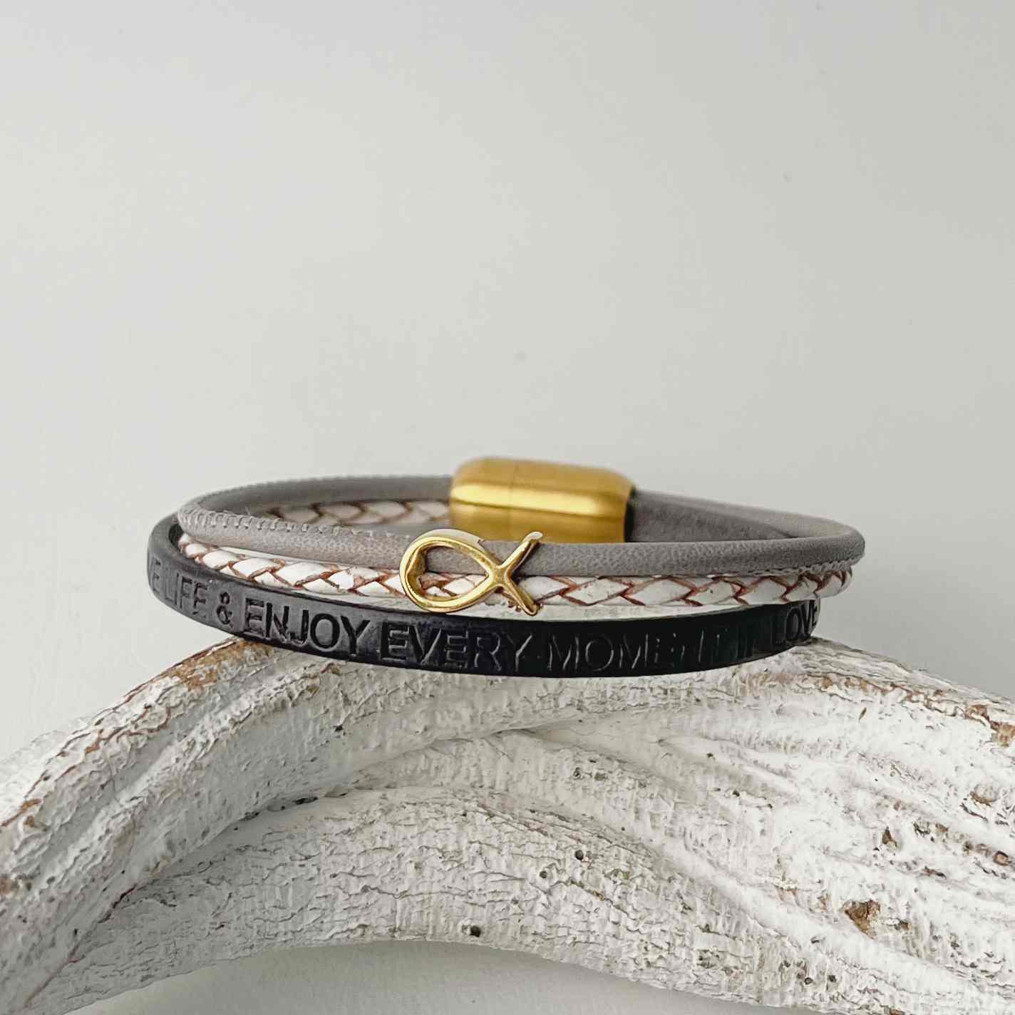 Es besteht aus einem 5 mm breiten Lederband in anthrazit mit Prägung „Love life“ und „enjoy every Moment“, einem hellgrauen Nappalederband (ca. 2,5 mm) und einem weißen geflochtenen Lederband (ca. 2,5 mm). Die Farben harmonieren sehr schön zusammen und lassen sich prima kombinieren. Geschlossen wird es mit einem hochwertigen Magnetverschluss aus mattierten gelbgoldfarbenen Edelstahl.