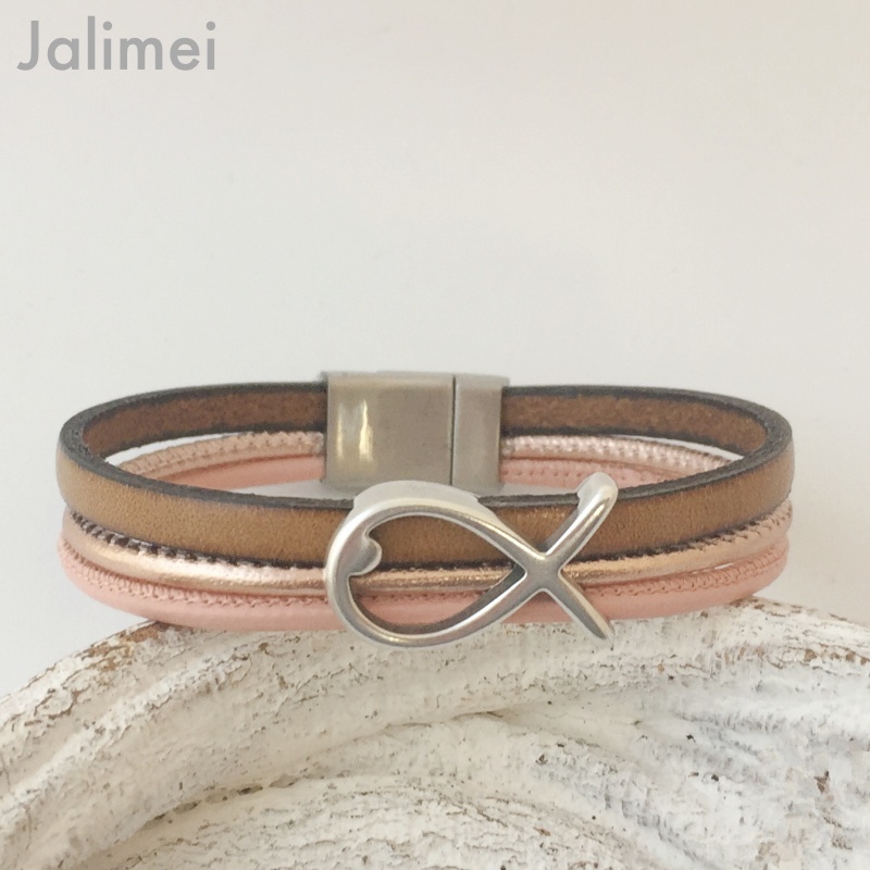 Schönes Armband bestehend aus 3 Lederbändern in den Farben beige, roségold und rosa. Aufgepeppt ist das Armband mit einem Metallschieber Fisch. Ein wunderbares Geschenk zur Konfirmation/Firmung.