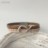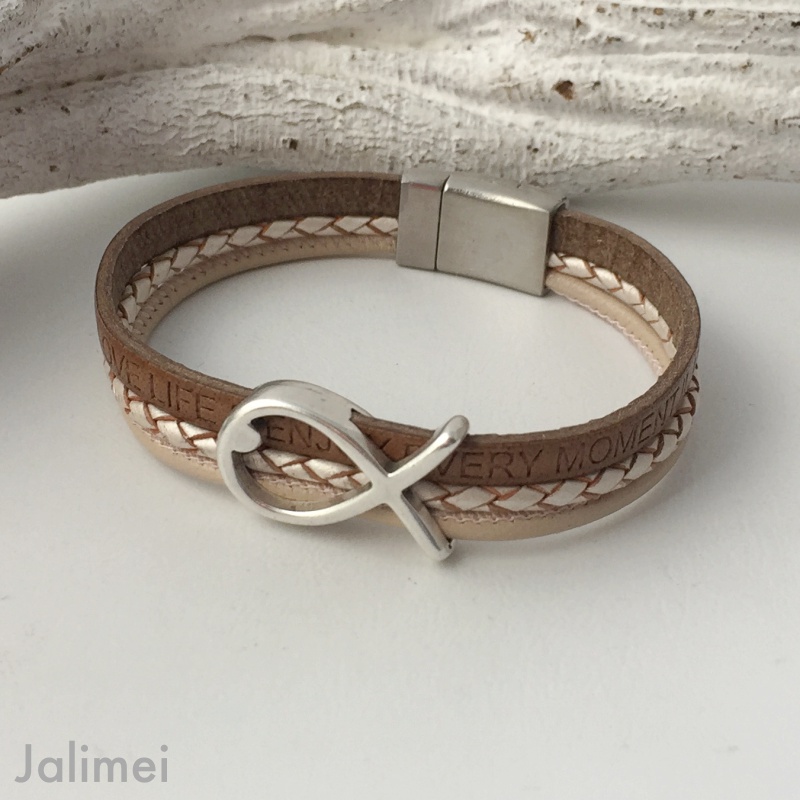 Schönes Armband bestehend aus 3 Lederbändern in verschiedenen Beigetönen. Auf dem breiteren Band sind die Schriftzüge „Love Life“ und „enjoy every Moment“ eingeprägt. Aufgepeppt ist das Armband mit einem Metallschieber Fisch.