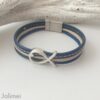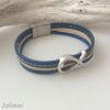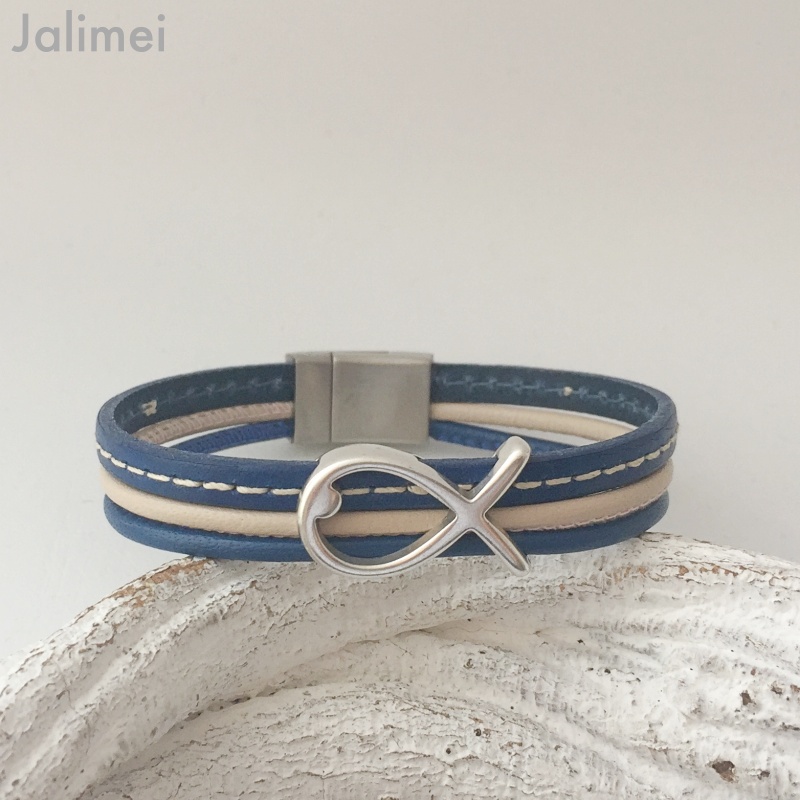 Schönes Armband bestehend aus 3 Lederbändern in den Farben blau und beige. Das breitere Band ist mit einer mittigen Ziernaht aufgepeppt. Das Armband ist mit einem Metallschieber Fisch verziert.