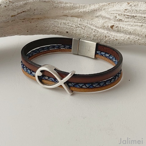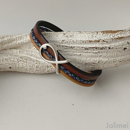 Das Armband besteht aus 3 echten Lederbändern: ein flaches Lederband (ca. 5 mm) in braun, ein geflochtenes Lederband (ca. 2,5 mm) in antikblau und ein Nappalederband (ca. 2,5 mm) in hellbraun.