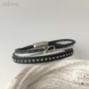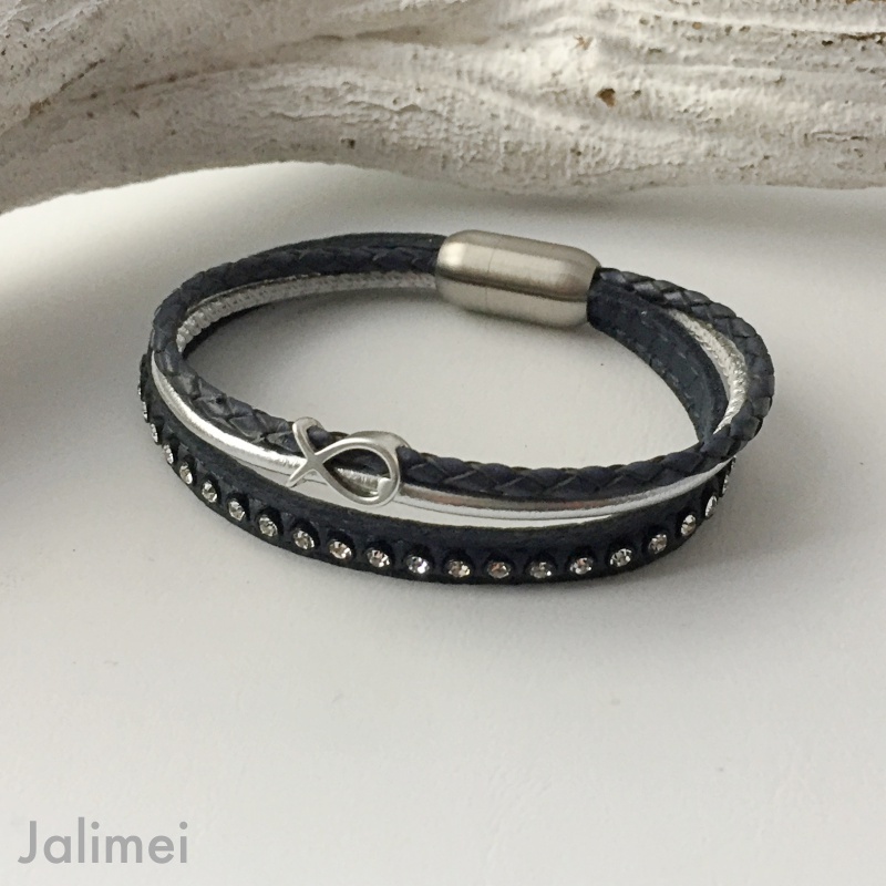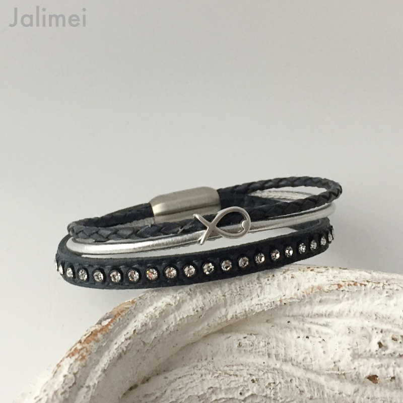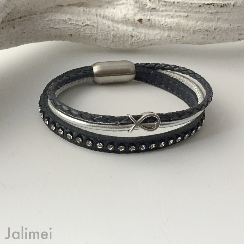 Schönes Armband bestehend aus 3 Lederbändern: ein 6 mm breites mit Swarovskisteinchen besetztes Nappalederband in dunkelblau, ein silbernes Nappalederband und ein dunkelblaues geflochtenes Lederband. Aufgepeppt ist das Armband mit einem kleinen Metallschieber Fisch.