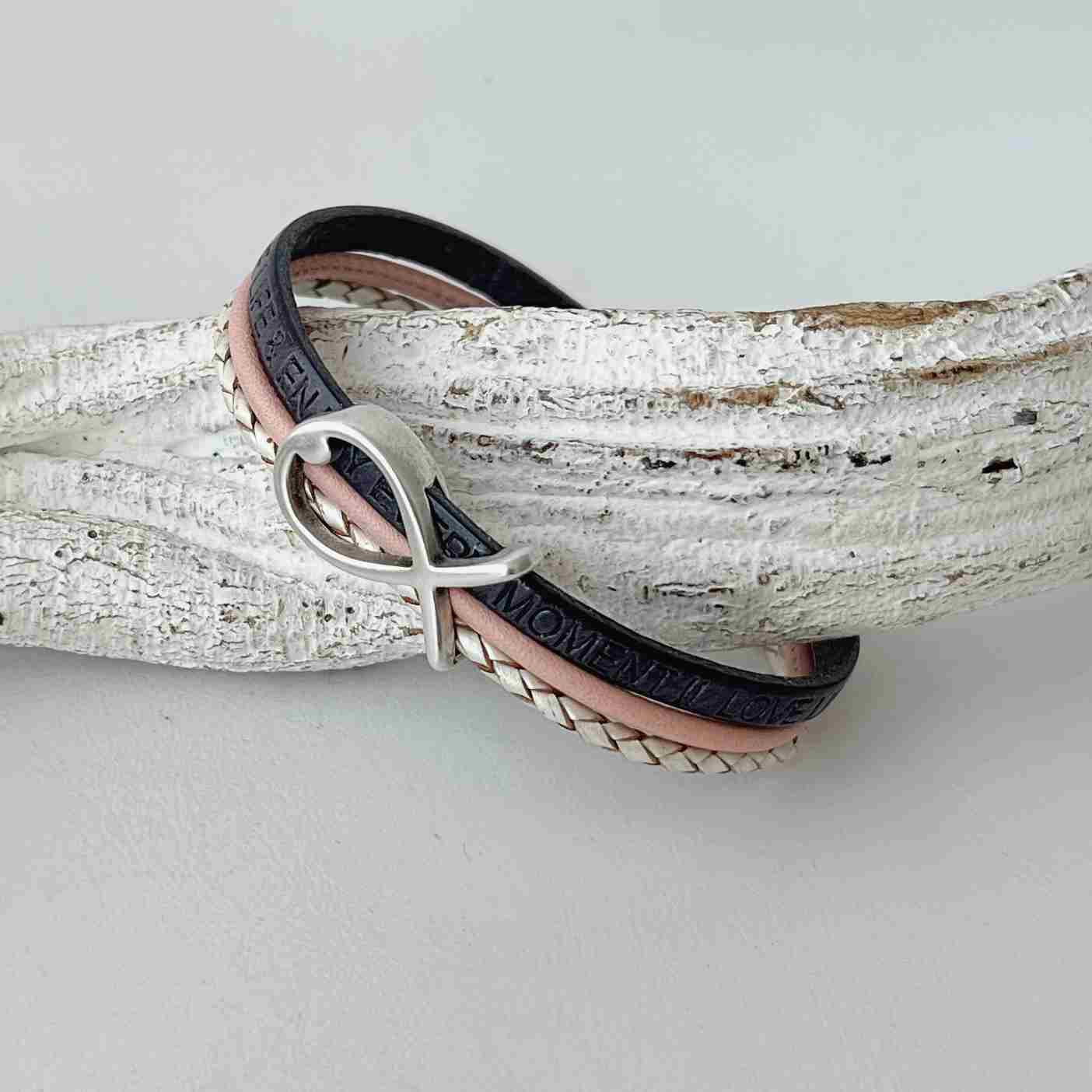 Das Armband besteht aus 3 echten Lederbändern. Neben einem rosafarbenem Nappalederband (ca. 2,5 mm) und einem geflochtenen Lederband (ca. 2,5 mm) in Perlmutt ist auch ein ca. 5 mm breites Lederband in anthrazitgrau mit den eingeprägten Schriftzügen „love life“ und „enjoy every Moment“ verarbeitet. Ich finde diese Schriftzüge besonders passend für diesen Anlass, weil es ja Wünsche sind, die man einem jungen Menschen gern mit auf den Weg gibt.