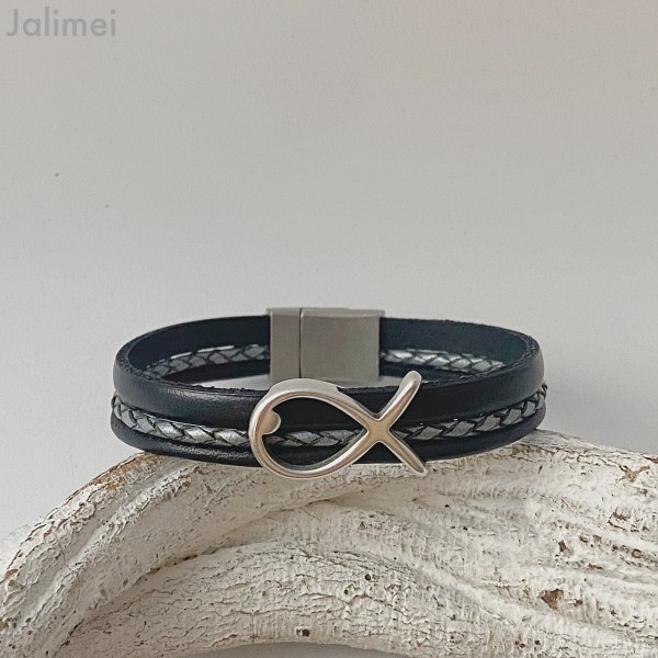 Das Armband besteht aus 3 Lederbändern: ein flaches schwarzes Lederband (ca. 5 mm), ein geflochtenes Lederband (ca. 2,5 mm) in stahlgrau und ausserdem ein schwarzes Nappalederband (ca. 2,5 mm). Die Bänder werden mit dem Metallfisch zusammengehalten. Der Fisch hält diese drei Bänder zusammen.