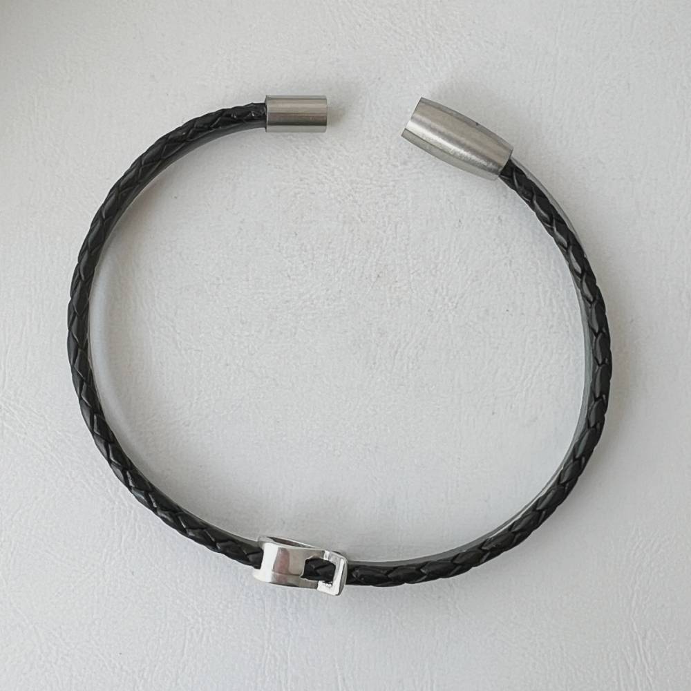 Es besteht aus einem 2,5 mm geflochtenem Lederband in den Farben schwarz oder blau sowie zwei farblich dazu abgestimmten feinen Lederbändern. Die Farben harmonieren sehr schön zusammen und lassen sich prima kombinieren. Geschlossen wird es mit einem hochwertigen Magnetverschluss aus mattierten Edelstahl.