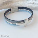 Schönes Armband bestehend aus 3 Lederbändern in den Farben stahlgrau, weiß und hellblau. Aufgepeppt ist das Armband mit einem Metallschieber Kreuz (Maße ca. 30 x 18 mm). Ein wunderbares Geschenk zur Konfirmation/Firmung.
