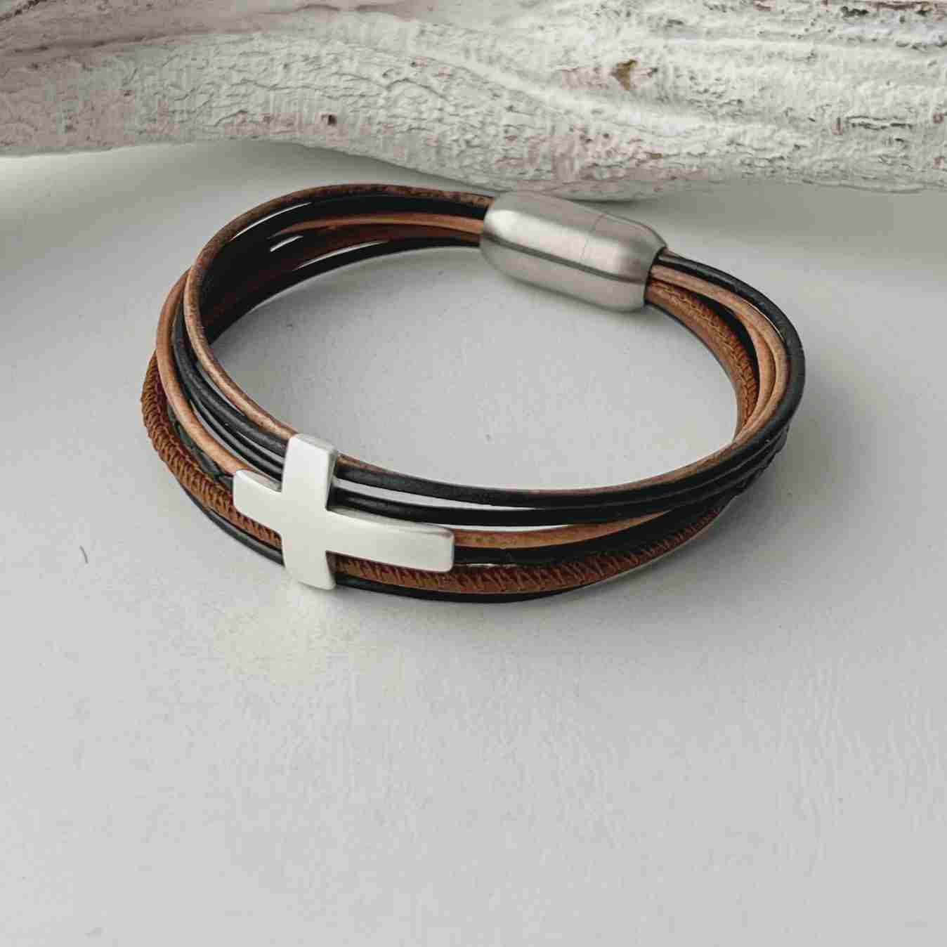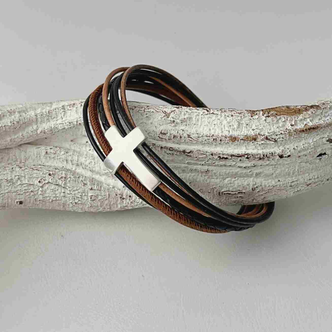 Dieses sehr schöne Armband Kreuz Konfirmation schwarz-braun aus echtem Leder mit dem Metallelement Kreuz (ca. 15 x 21 mm) ist ein schönes Geschenk zur Konfirmation, Firmung, Kommunion oder Taufe. Es besteht aus einem geflochtenem schwarzen Lederband (ca. 2,5 mm), einem braunen Nappalederband (ca. 2,5 mm) und 5 farblich darauf abgestimmte dünnere Lederbänder. Das Kreuz hält einige Bänder zusammen.