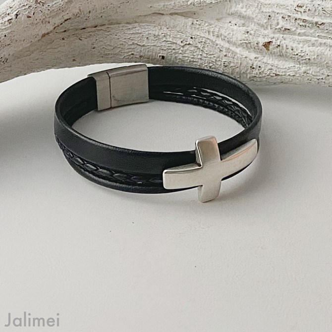 Auf die Bänder ist ein schönes seitlich liegendes Metallkreuz gezogen, wodurch die Bänder zusammengehalten werden. Das Kreuz ist leicht gebogen und schmiegt sich so dem Verlauf des Armbandes schön an.