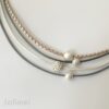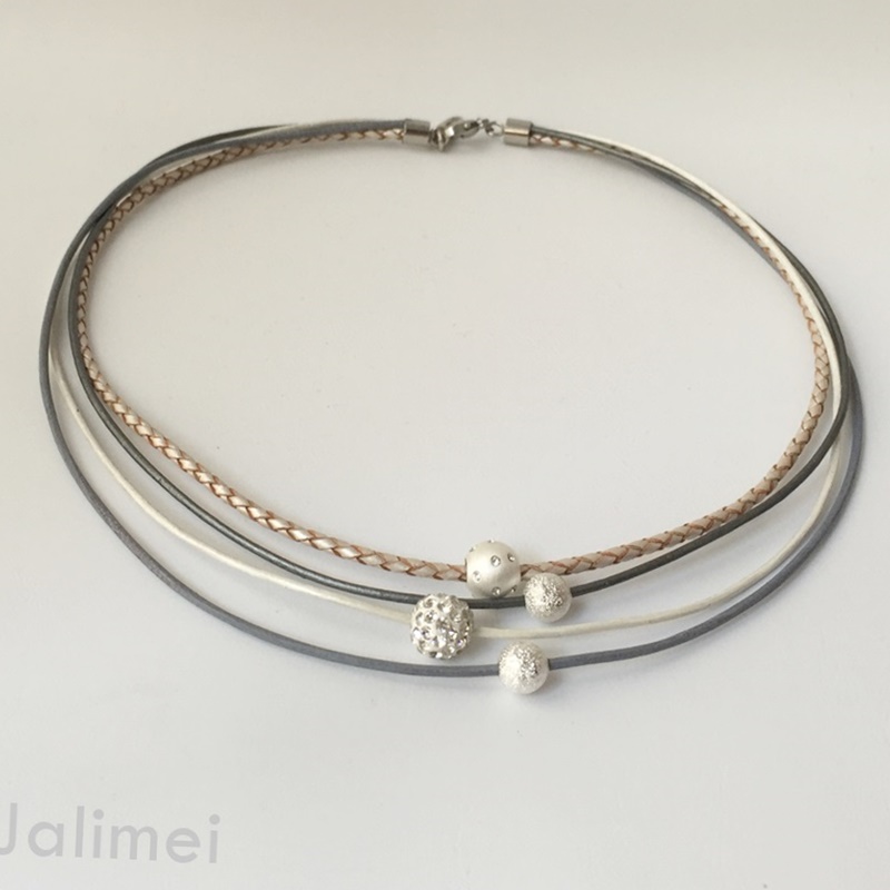 Schönes Collier bestehend aus 3 Lederbändern mit einer Stärke von 1,5 mm und einem geflochtenen Lederband in der Stärke von 2,5 mm. Auf die Bänder sind eine Kugel mit Glitzersteinchen, eine Glitzerkugel und zwei Silberperlchen gezogen. Sie sind auf den Bändern beweglich. Geschlossen wird das Collier mit einem Edelstahlkarabiner. Die Länge des kürzesten Bandes beträgt ca. 45 cm.