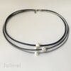 Das Collier besteht aus 4 Lederbändern, die nur am Ende in einer Edelstahl-Endkappe zusammengehalten werden. Die Bänder sind also beweglich, aber in der Länge aufeinander abgestimmt.
