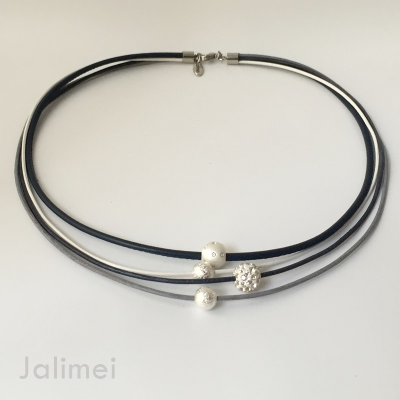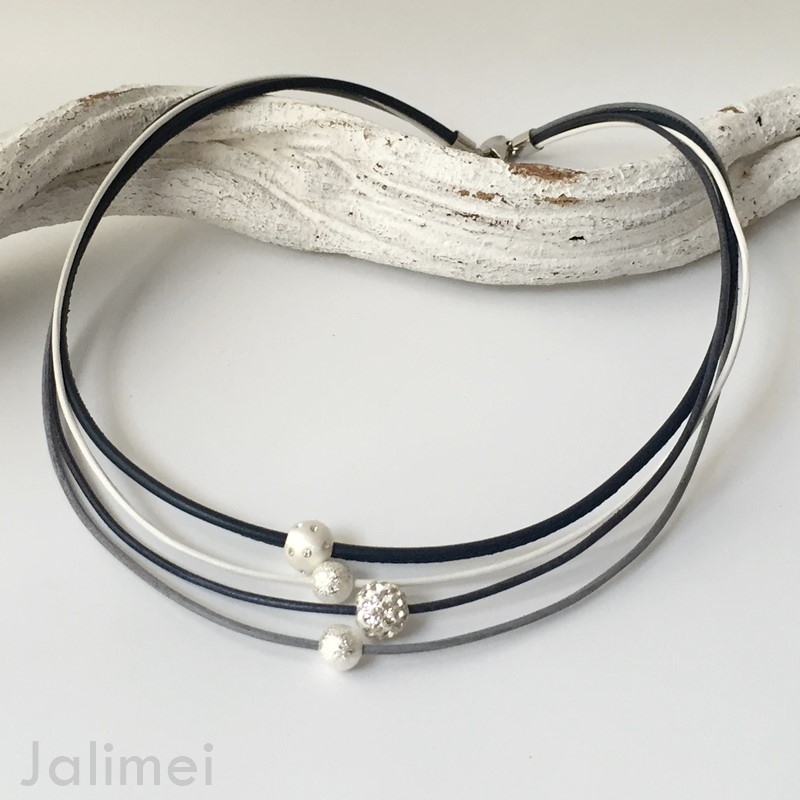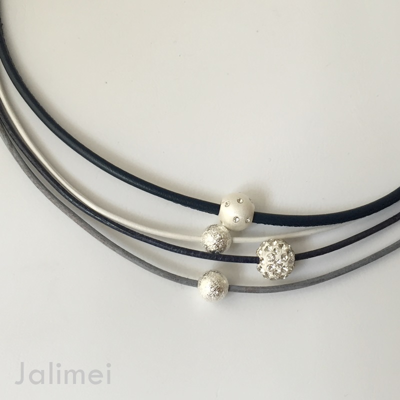 Verarbeitet ist ein Nappalederband (ca. 2,5 mm), auf das eine mit Strasssteinchen besetzte Edelstahlkugel (ca. 10 mm) gezogen ist. Dazu kombiniert sind drei Lederbänder in einer Stärke von ca. 1,5 mm. Auf einem Band ist eine mit ganz vielen Strassteinchen besetzte Kugel gezogen, auf die anderen beiden jeweils eine diamattierte Edelstahlperle (ca. 8 mm).