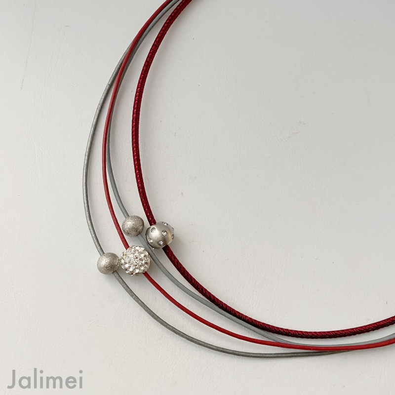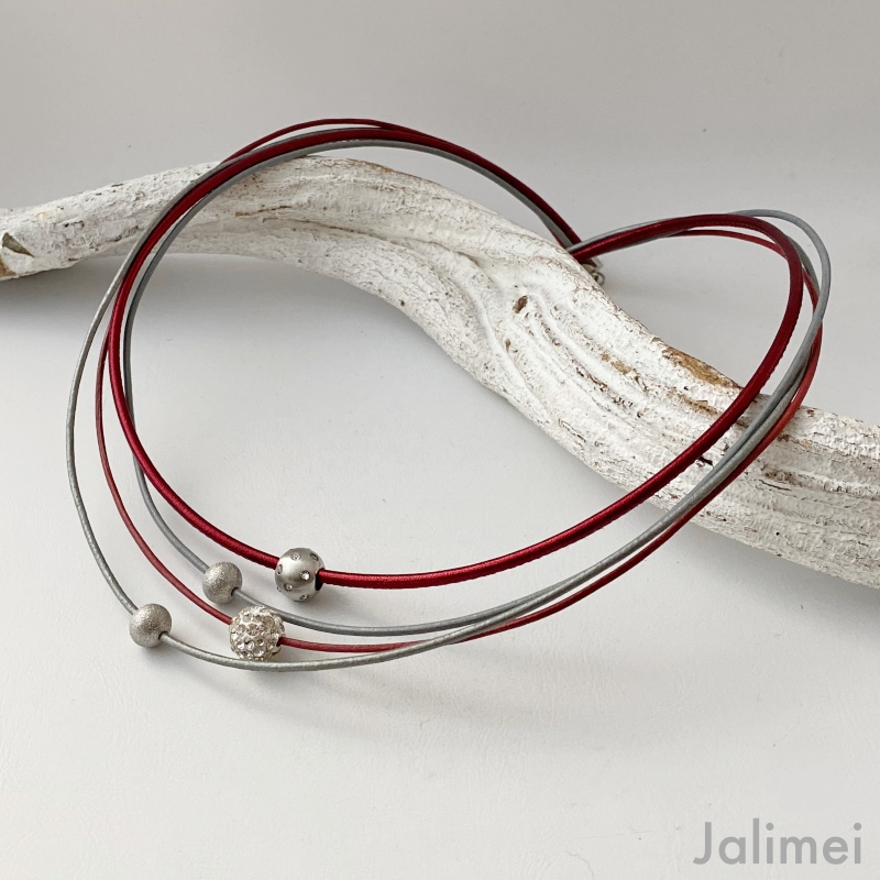 Dieses wunderschöne Collier Glitzer mit Kugel weinrot grau besteht aus 4 echten Lederbändern. Es sind sowohl 3 Lederbänder mit einer Stärke von 1,5 mm wie auch ein Nappa-Lederband in der Stärke von 2,5 mm verarbeitet. Auf die Bänder sind eine mit Straßsteinchen besetzte Kugel (Edelstahl), eine Glitzerkugel und zwei diamantierte Edelstahlperlen gezogen. Sie sind auf den Bändern teils beweglich. Das Collier lässt sich mit einem Edelstahlkarabiner schließen.
