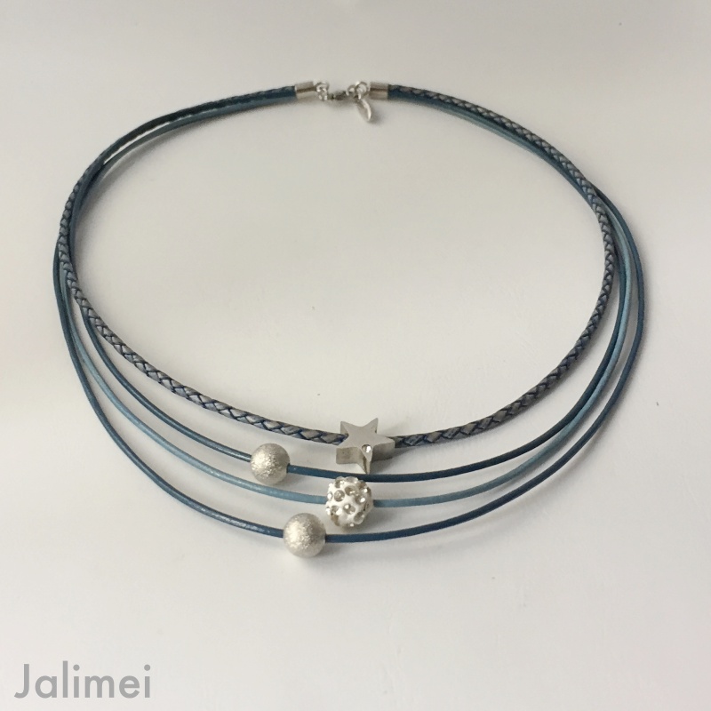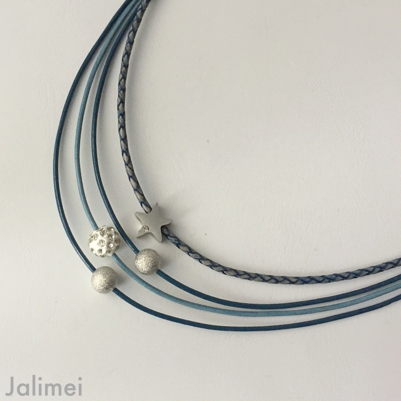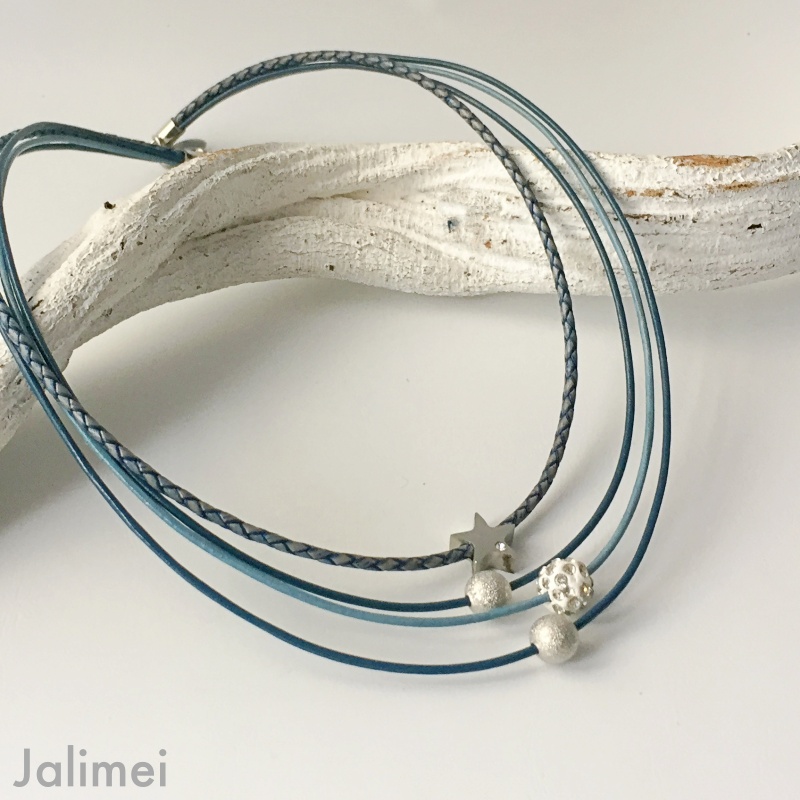 Schönes Collier bestehend aus 3 Lederbändern mit einer Stärke von 1,5 mm und einem geflochtenen Lederband in der Stärke von 2,5 mm. Auf die Bänder sind ein Stern (Edelstahl) mit Glitzersteinchen, eine Glitzerkugel und zwei silberfarbene Perlchen gezogen. Sie sind auf den Bändern beweglich. Geschlossen wird das Collier mit einem Edelstahlkarabiner. Die Länge des kürzesten Bandes beträgt ca. 45 cm.