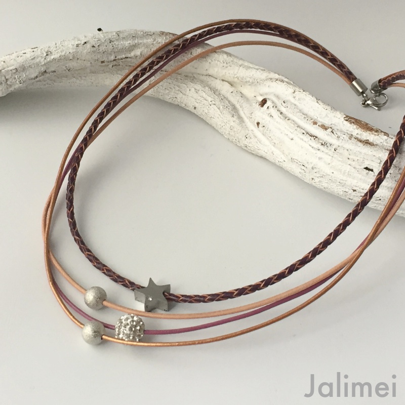 Schönes Collier bestehend aus 3 Lederbändern mit einer Stärke von 1,5 mm und einem geflochtenen Lederband in der Stärke von 2,5 mm. Auf die Bänder sind ein Stern (Edelstahl) mit Glitzersteinchen, eine Glitzerkugel und zwei silberfarbenen Perlchen gezogen. Sie sind auf den Bändern beweglich. Geschlossen wird das Collier mit einem Edelstahlkarabiner. Die Länge des kürzesten Bandes beträgt ca. 45 cm.