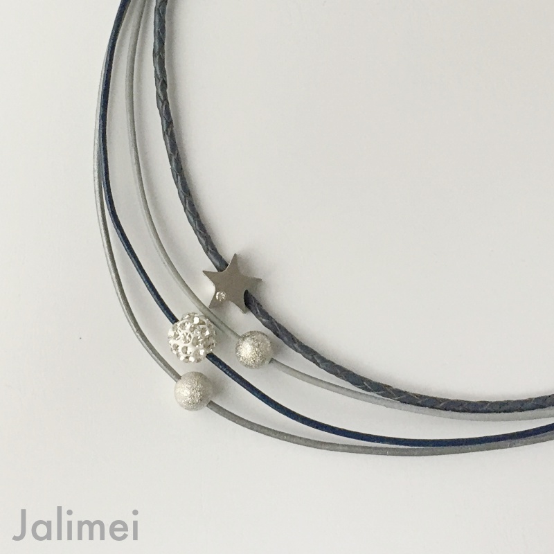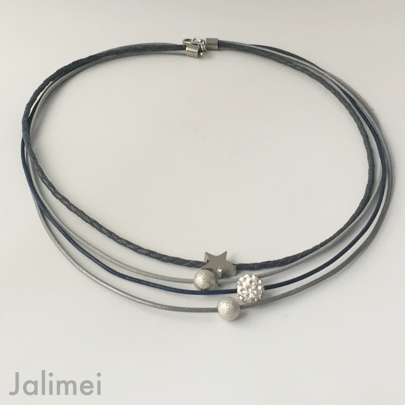 Schönes Collier bestehend aus 3 Lederbändern mit einer Stärke von 1,5 mm und einem geflochtenen Lederband in der Stärke von 2,5 mm. Auf die Bänder sind ein Stern (Edelstahl) mit Glitzersteinchen, eine Glitzerkugel und zwei silberfarbenen Perlchen gezogen. Sie sind auf den Bändern beweglich. Geschlossen wird das Collier mit einem Edelstahlkarabiner. Die Länge des kürzesten Bandes beträgt ca. 45 cm.