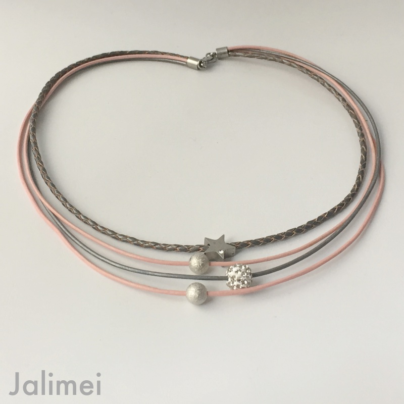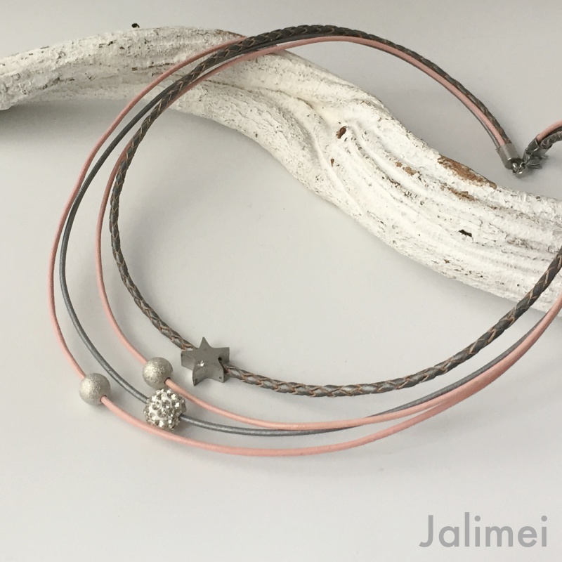 Schönes Collier bestehend aus 3 Lederbändern mit einer Stärke von 1,5 mm und einem geflochtenen Lederband in der Stärke von 2,5 mm. Auf die Bänder sind ein Stern (Edelstahl) mit Glitzersteinchen, eine Glitzerkugel und zwei Silberperlchen gezogen. Sie sind auf den Bändern beweglich. Geschlossen wird das Collier mit einem Edelstahlkarabiner. Die Länge des kürzesten Bandes beträgt ca. 45 cm.