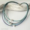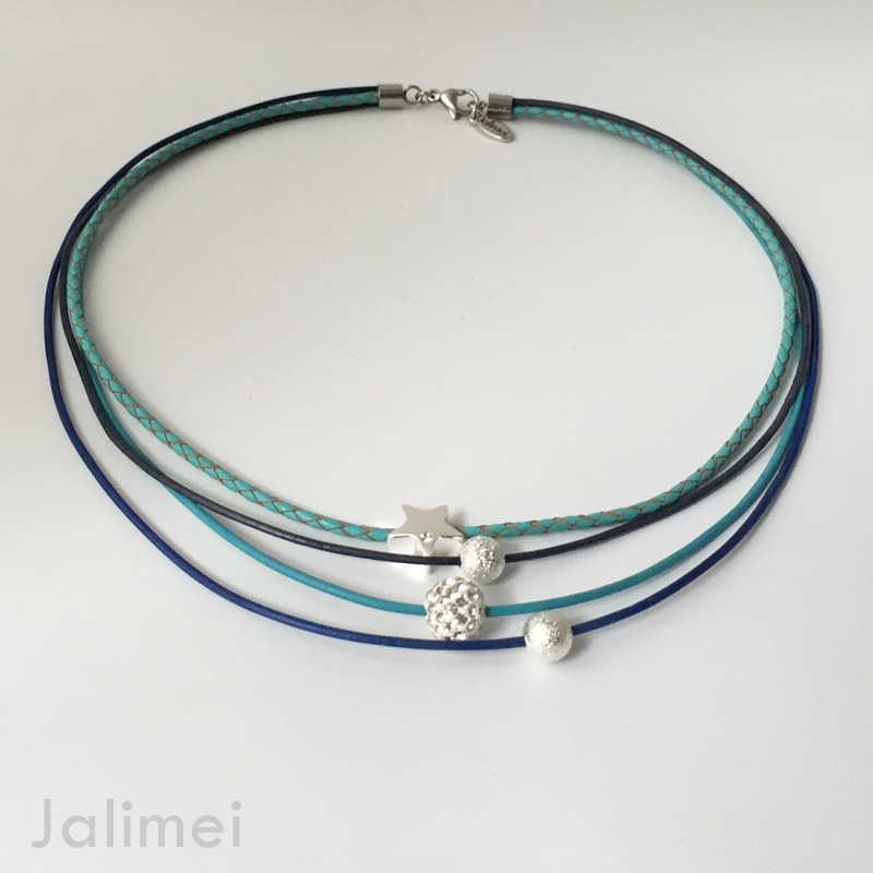 Schönes Collier bestehend aus 3 Lederbändern mit einer Stärke von 1,5 mm und einem geflochtenen Lederband in der Stärke von 2,5 mm. Auf die Bänder sind ein Stern mit Glitzersteinchen, eine Glitzerkugel und zwei Silberperlchen gezogen. Sie sind auf den Bändern beweglich. Geschlossen wird das Collier mit einem Edelstahlkarabiner. Die Länge des kürzesten Bandes beträgt ca. 45 cm.