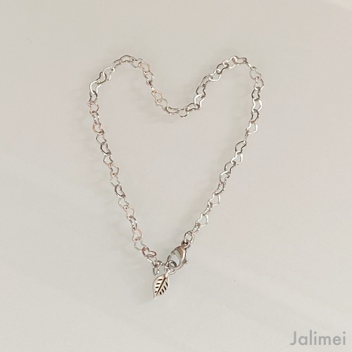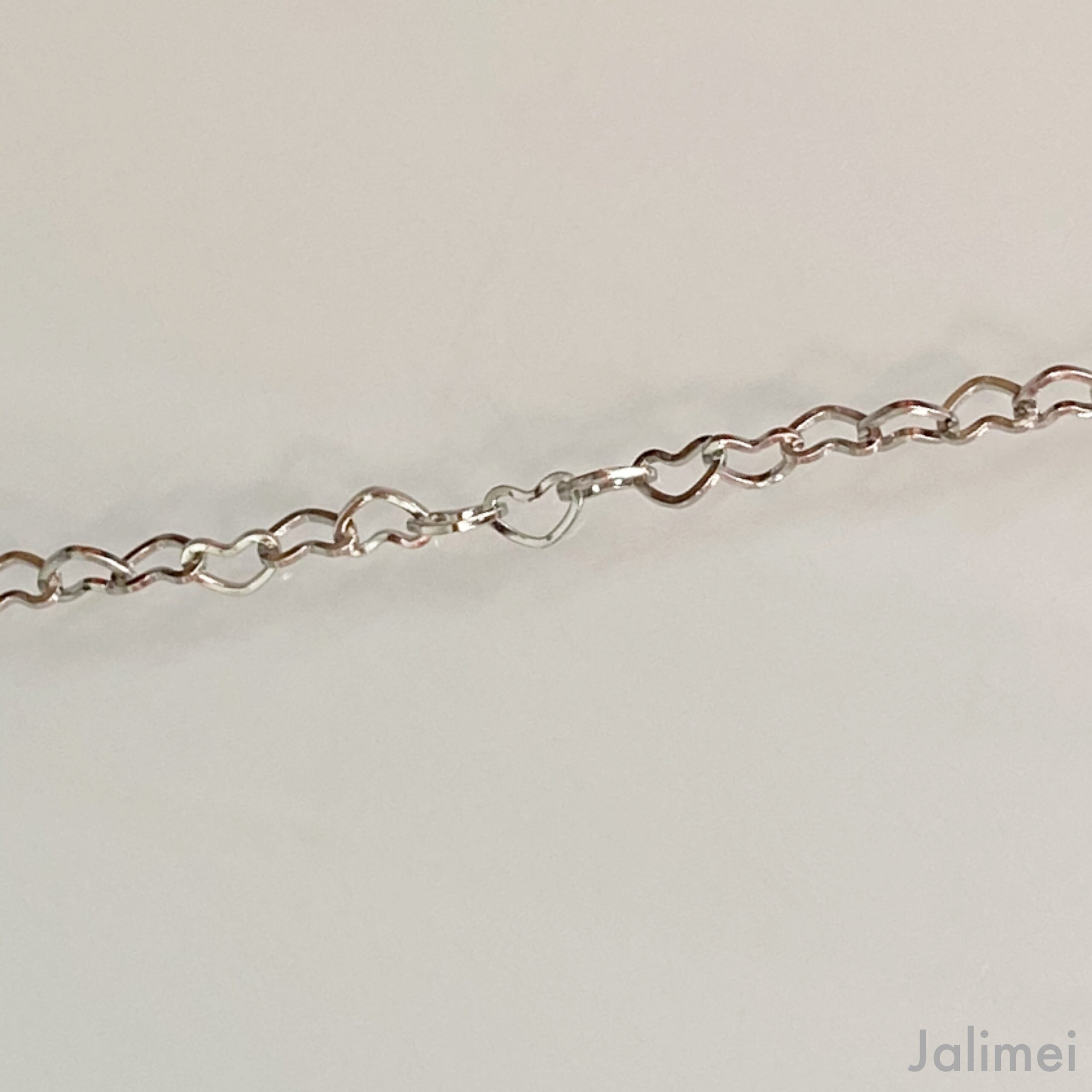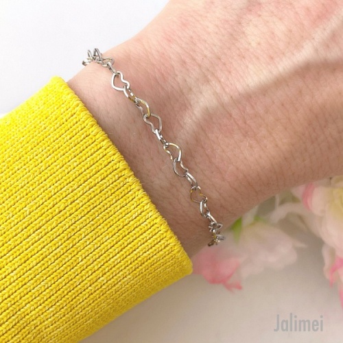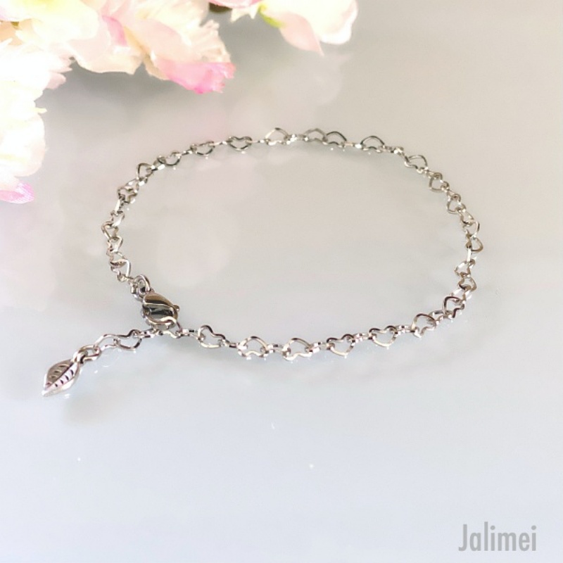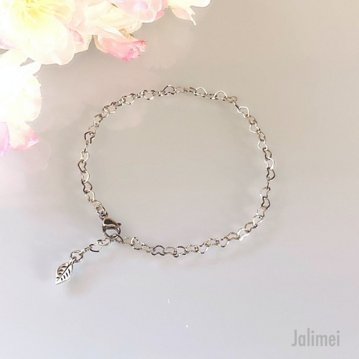Die Kette besteht aus lauter kleinen Herzchen (ca. 5×3 mm), die ineinander verschlungen sind. An einem Ende ist ein Edelstahlkarabiner angebracht, mit dem man das Armband stufenlos schließen kann. Somit ist es individuell an die Armgröße anpassbar. Den Rest des Kettchen lässt man einfach hängen, was dann gleich ein bisschen dekorativen Charakter hat. Am Ende des Kettchen ist ein kleines Blatt angebracht.
