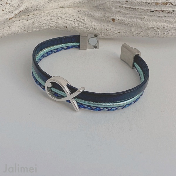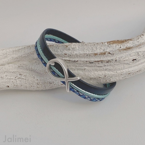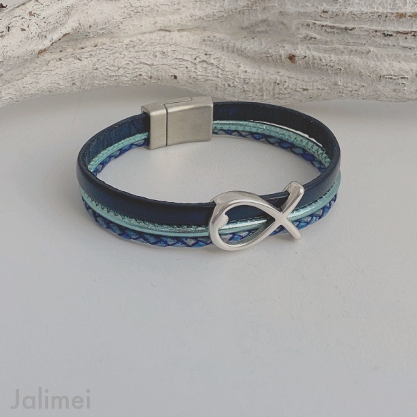 Du suchst ein besonderes Geschenk zur Konfirmation, Kommunion oder Taufe? Die handgefertigten Armbänder aus echtem Leder wie Jalimei Armband Fisch navy-mint eigenen sich besonders schön dafür.