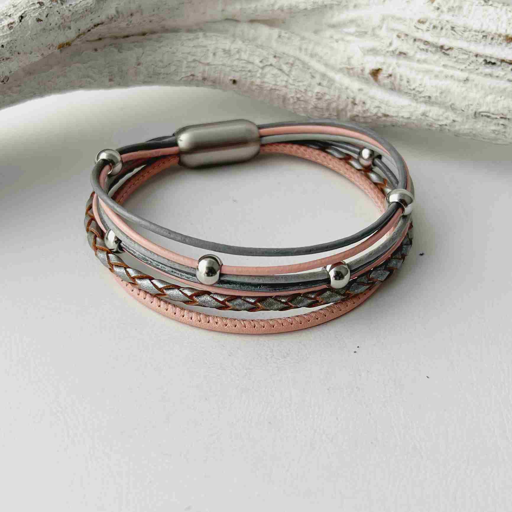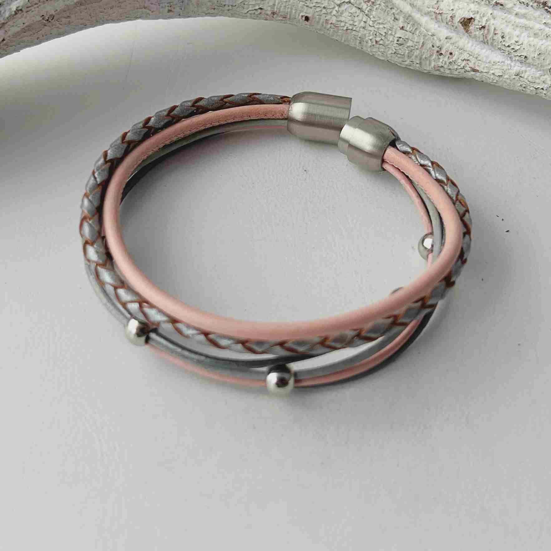 Verarbeitet sind ein geflochtenes Lederband (ca. 2,5 mm) in antikgrau, ein rosa Nappalederband (ca. 2,5 mm) und ausserdem 5 farblich dazu abgestimmten Lederbändern (ca. 1,5 mm). Die Perlen halten immer 2-3 Bändchen zusammen.