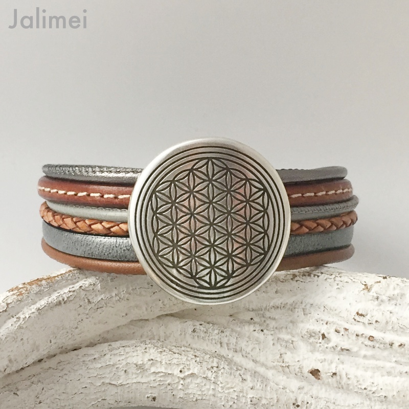 Schönes Armband bestehend aus 6 verschiedenen echten Lederbändern in den Farben grau und cognacbraun. Aufgepeppt ist es mit einem Metallschieber Blume des Lebens (Durchmesser ca. 33 mm) und wird mit einem hochwertigen Edelstahl-Magnetverschluß geschlossen.