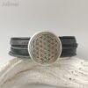 Schönes Armband bestehend aus 6 verschiedenen echten Lederbändern in den Farben schwarz und grau. Auf dem breiteren grauen Band sind die Wörter „Believe“, „Wish“ und „Dream“ eingeprägt. Aufgepeppt ist es mit einem Metallschieber Blume des Lebens (Durchmesser ca. 33 mm) und wird mit einem hochwertigen Edelstahl-Magnetverschluß geschlossen.