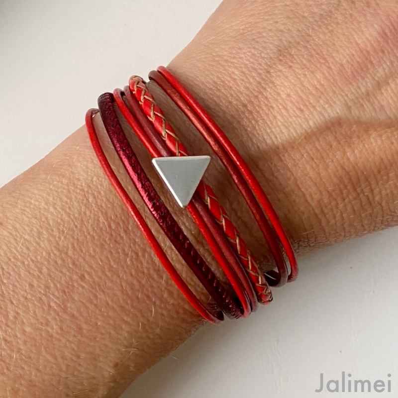 Das Lederarmband Dreieck rot für den Sommer ist ein feines Armband aus echtem Leder in verschiedenen Rottönen mit einem kleinen Metalldreieck (ca. 9 mm). Verwendet wurden 1,5 mm starke Lederbänder sowie ein Nappa- und ein geflochtenes Lederband mit einem Durchmesser von ca. 2,5 mm. Durch seine knallige Farbe pappt das Lederarmband Dreieck rot sehr schön schlichte Kleidung auf und ist ein toller Begleiter für den Sommer. Es wird mit einem hochwertigen Edelstahlmagnetverschluss geschlossen.
