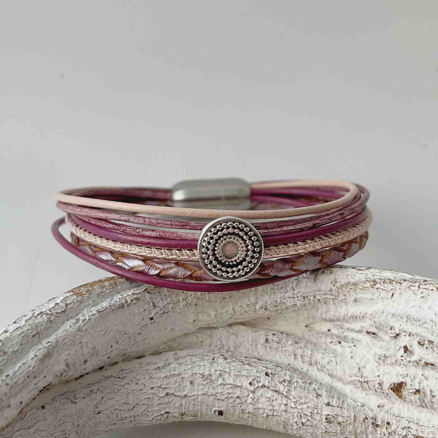 In dem Armband sind verschiedene Bänder verarbeitet: ein geflochtenes Lederband (ca. 2,5 mm) in einem zarten lila-metallic, ein Nappalederband (ca. 2,5 mm) in rosegold sowie 5 farblich darauf abgestimmte Lederbänder in einer Stärke von ca. 1,5 mm.