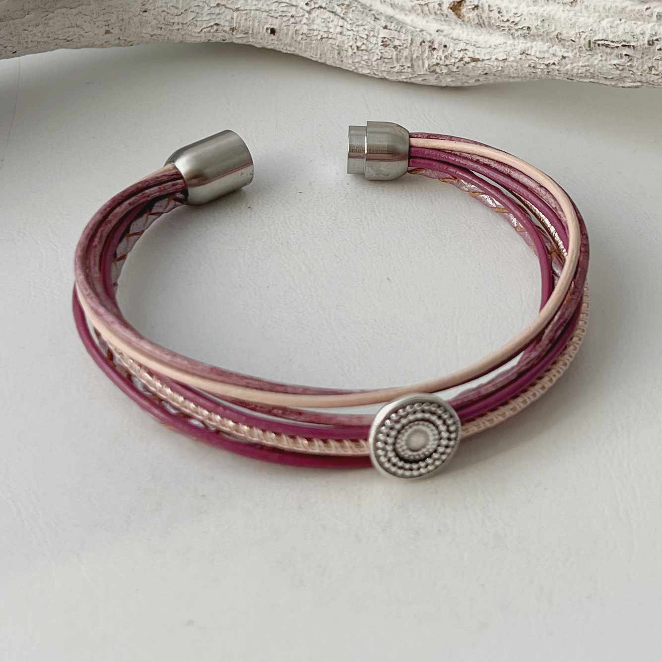Das Lederarmband Ethno beere lässt sich mit Hilfe eines hochwertigen Edelstahl-Magnetverschlusses leicht an- und ablegen.