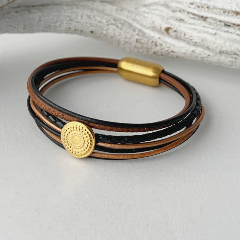 Verarbeitet sind ein schwarzes geflochtenes Lederband (ca. 2,5 mm), ein braunes gesäumtes Nappalederband (ca. 2,5 mm) sowie 5 farblich darauf abgestimmte Lederbänder mit einer Stärke von ca. 1,5 mm. Aufgepeppt ist das Armband mit einem goldenen Ethnoelement, durch das einige Bänder zusammenfasst sind.