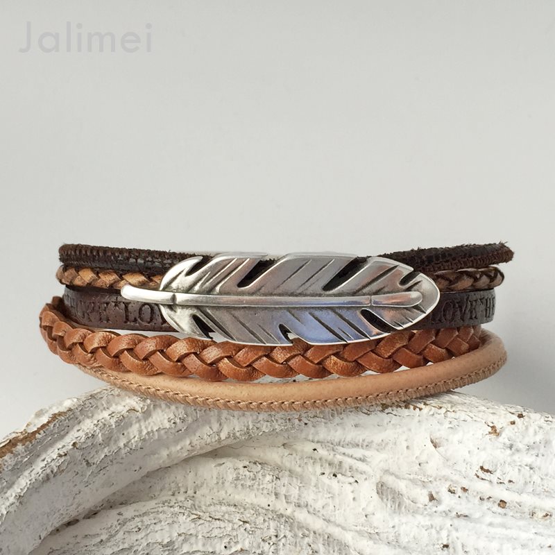Armband bestehend aus 5 verschiedenen Lederbändern in Brauntönen. Aufgepeppt ist es mit einem schönen Metallschieber Feder. Geschlossen wird das Armband mit einem Magnetverschluß.