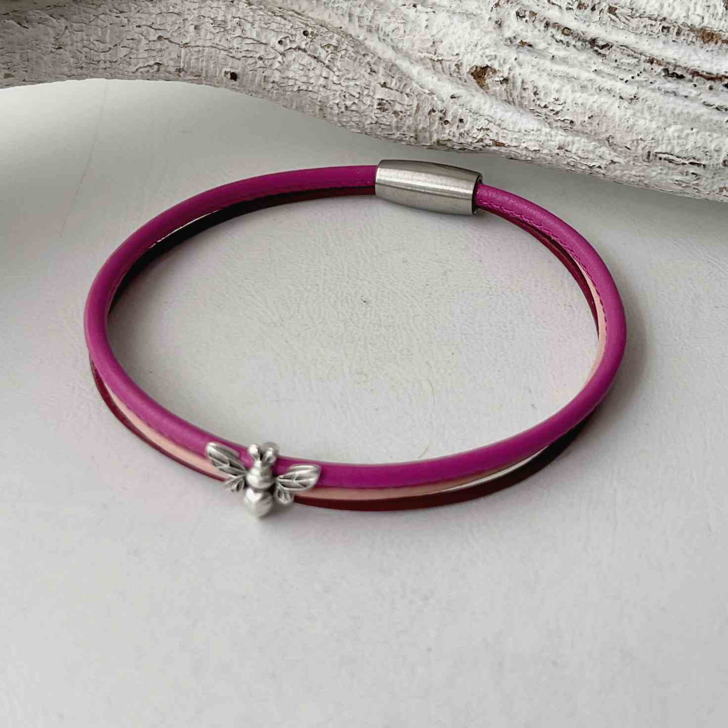 Verarbeitet ist ein Pinkes Nappalederband (ca. 2,5 mm) sowie zwei feine Lederbändchen (je ca. 1,5 mm) in beere und rosa. Die kleine Biene hält die Bänder zusammen.