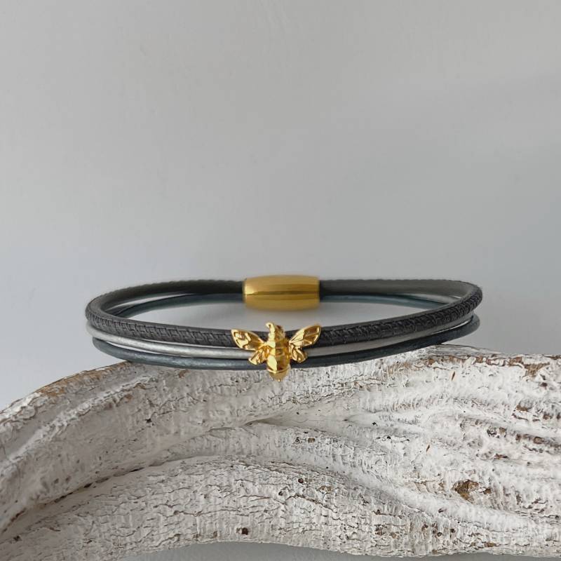 Verarbeitet ist ein dunkelgraues Nappalederband (ca. 2,5 mm) sowie zwei feine Lederbändchen (je ca. 1,5 mm) in Grautönen. Die kleine Biene hält die Bänder zusammen.