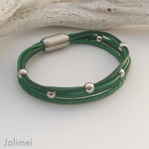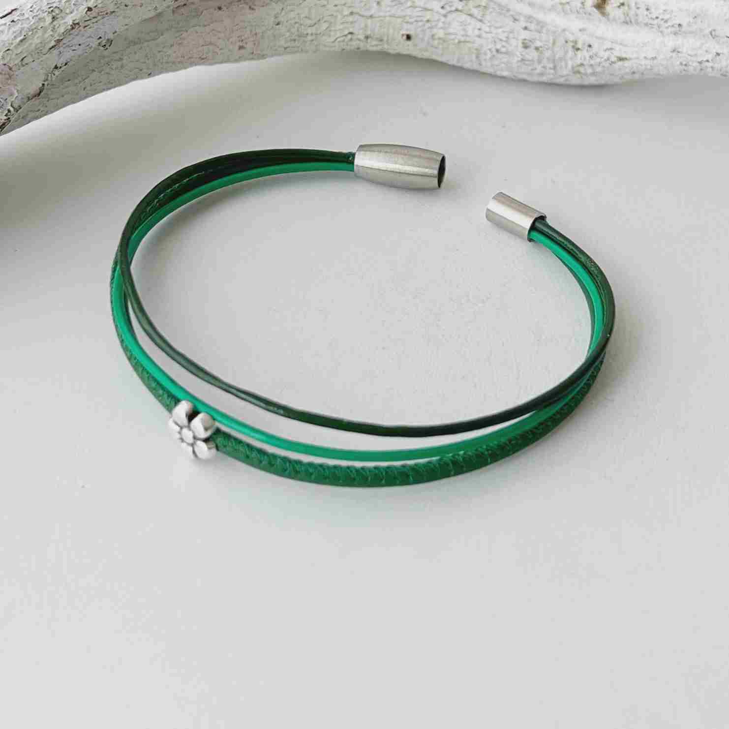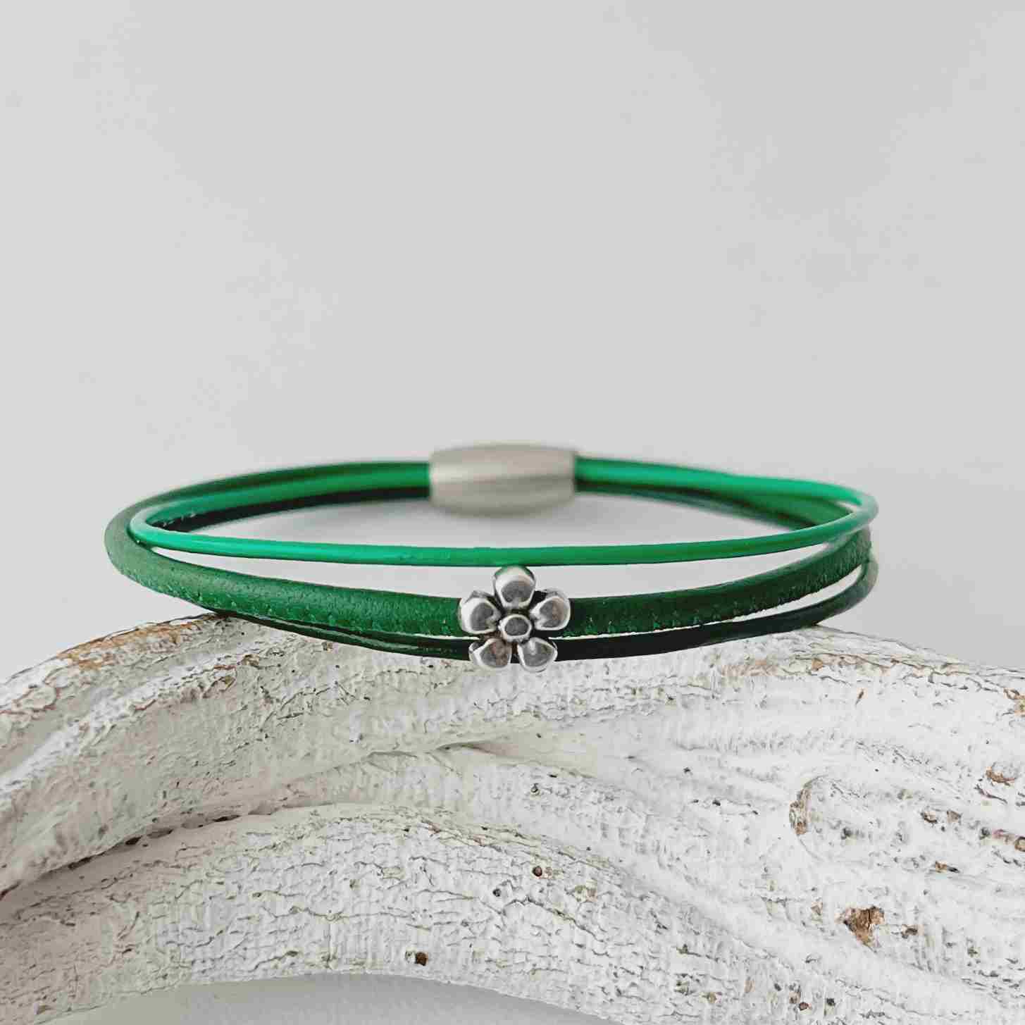 Auf ein grünes Nappalederband (ca. 2,5 mm) ist ein kleines Blümchen (ca. 8 mm) gezogen und dazu sind zwei feine Lederbänder (je ca. 1,5 mm) kombiniert.