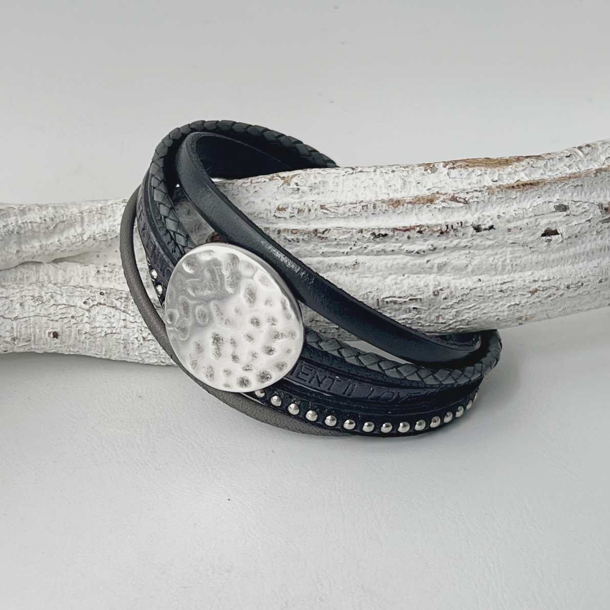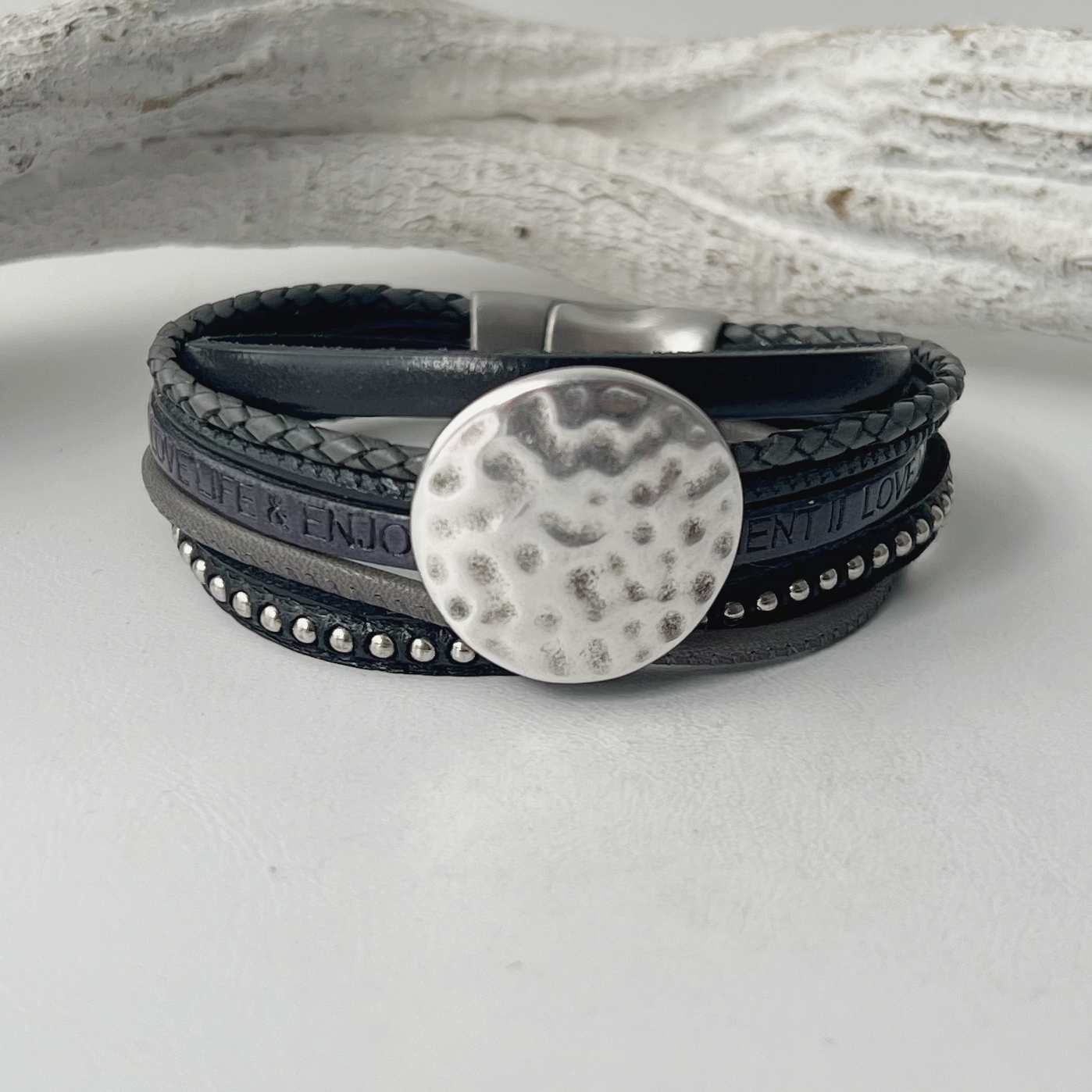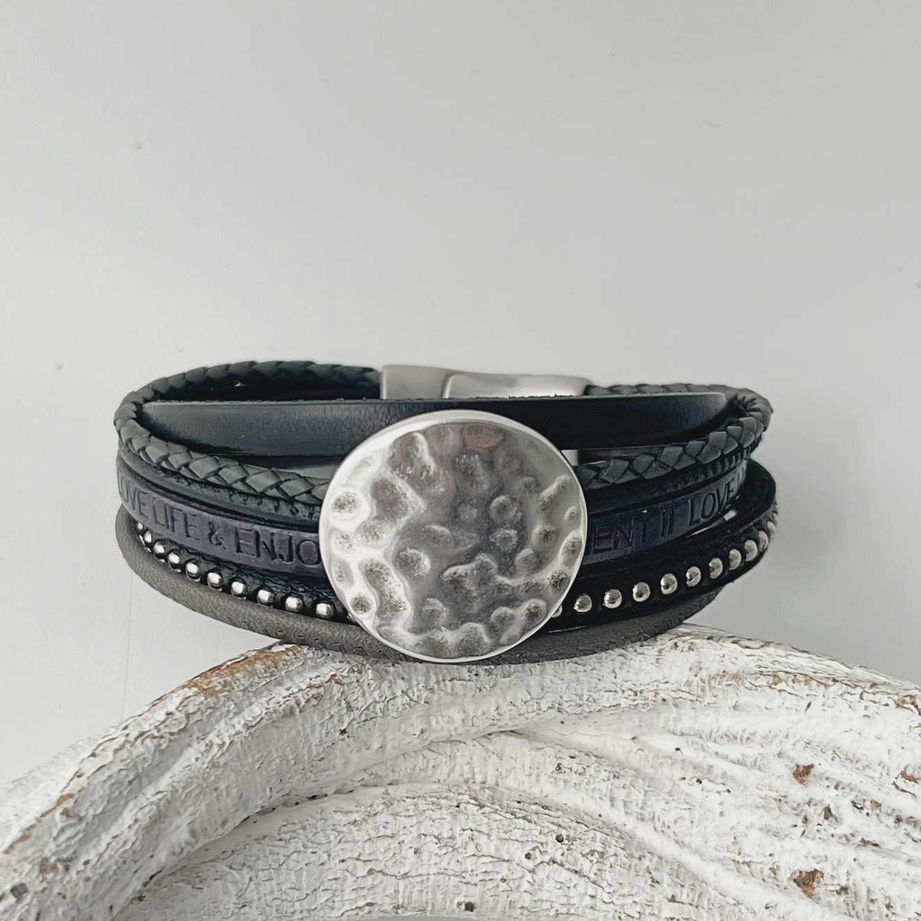 Verarbeitet sind 6 verschiedene Lederbänder. Neben dem schwarzen mit einer Kugelkette besetzten Lederband (ca. 6 mm) sind noch zwei weitere Flachriemen (ca. 5 mm) verarbeitet. Auf dem einen Band sind die Prägungen „love life“ und „enjoy every Moment aufgebracht. Ausserdem wurden zwei Nappalederbänder und ein geflochtenes Lederband (je ca. 2,5 mm) einbezogen.