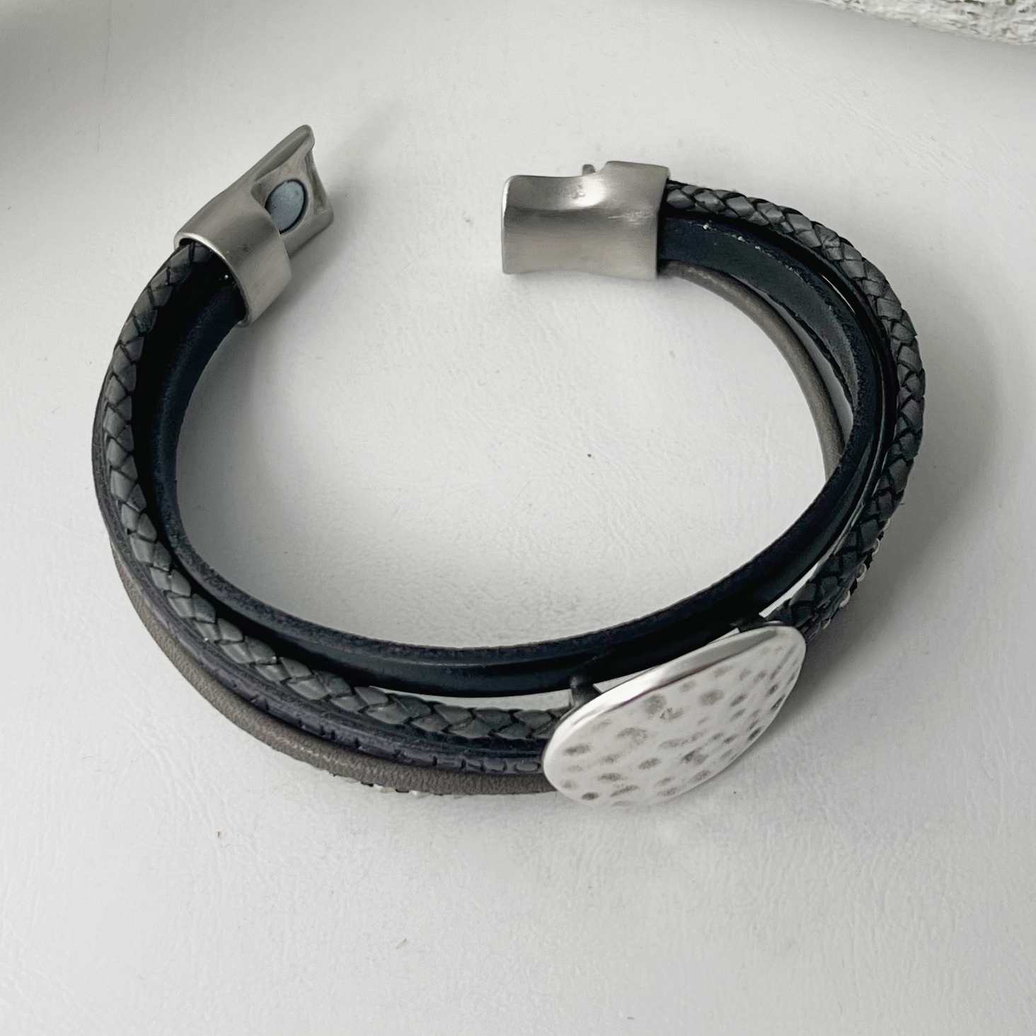 Mit Hilfe eines hochwertigen Edelstahl-Magnetverschlusses lässt sich das Lederarmband gehämmerte Scheibe grau leicht an- und ablegen.