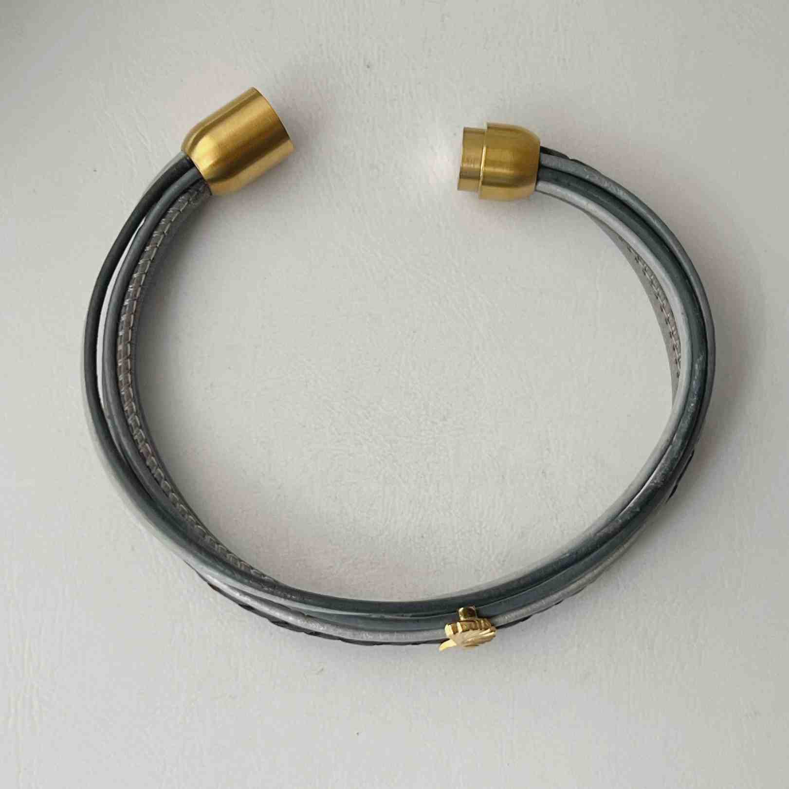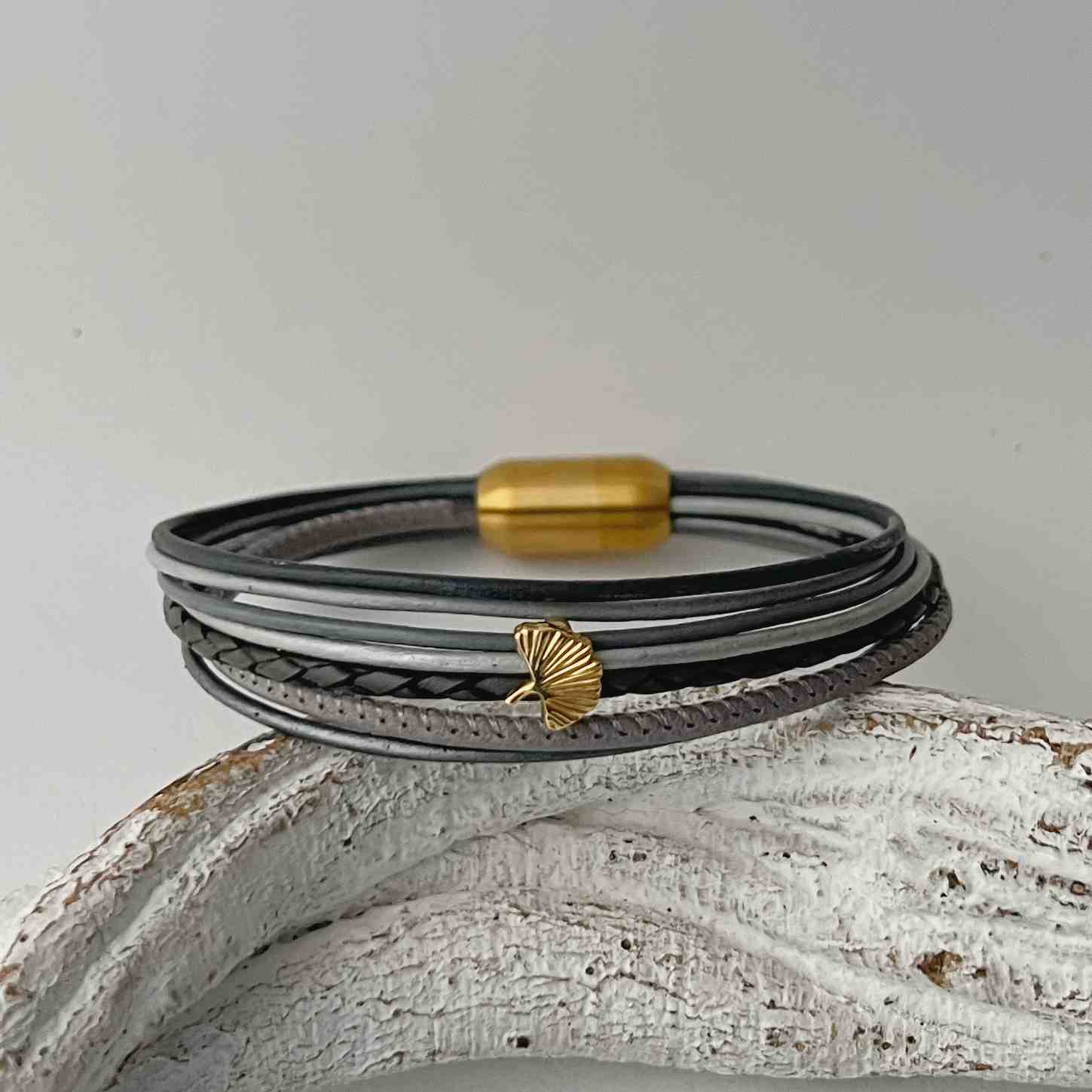 Bei dem Lederarmband Gingko Gold grau harmonieren die grauen Bänder und die goldenen Elemente sehr schön zusammen.