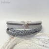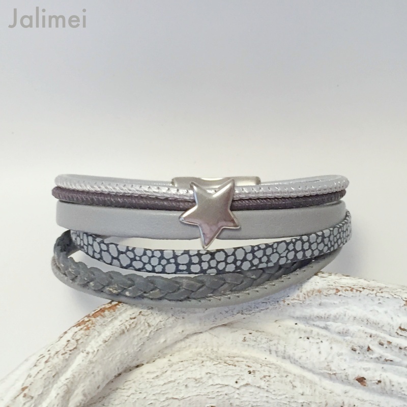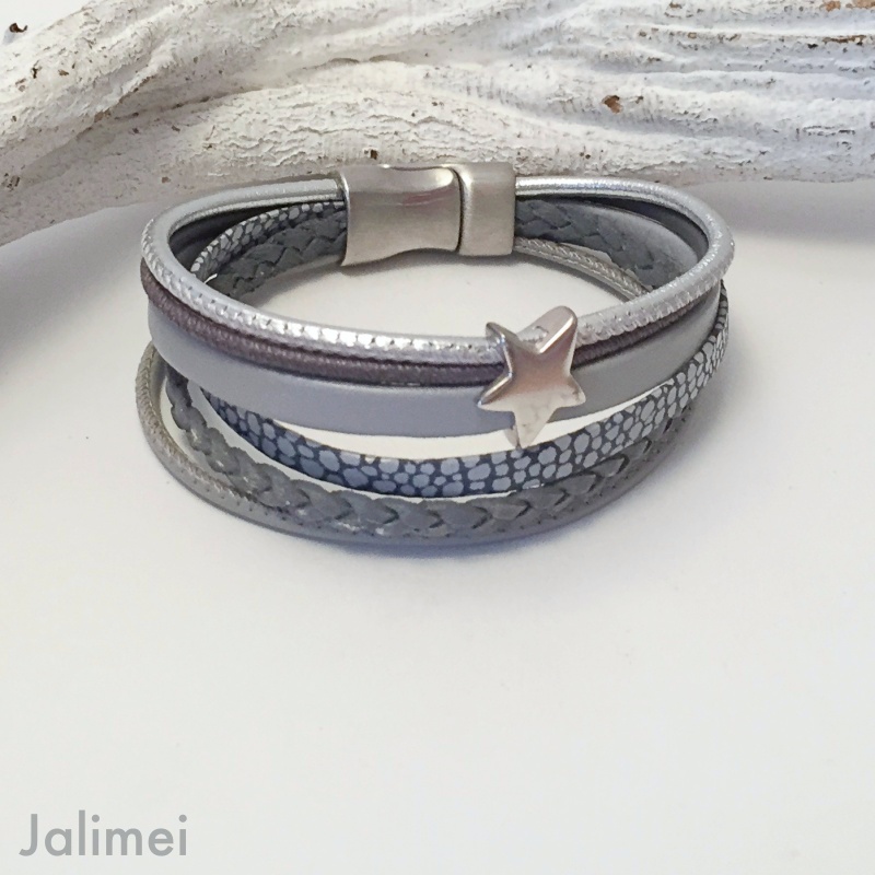 Schönes Armband bestehend aus 6 verschiedenen Lederbändern in verschiedenen Grautönen. Aufgepeppt ist das Armband mit einem Metallschieber Stern.