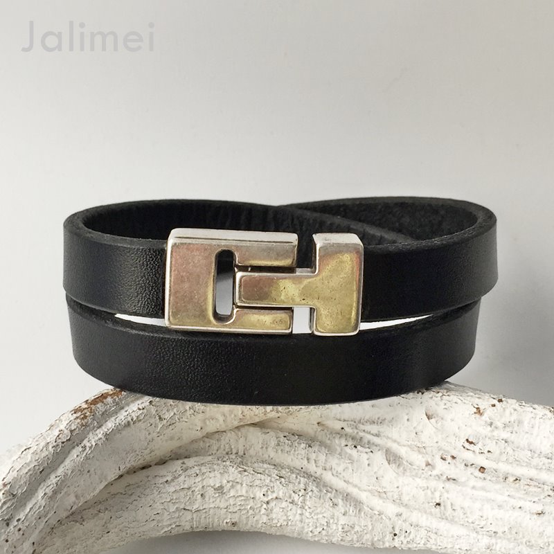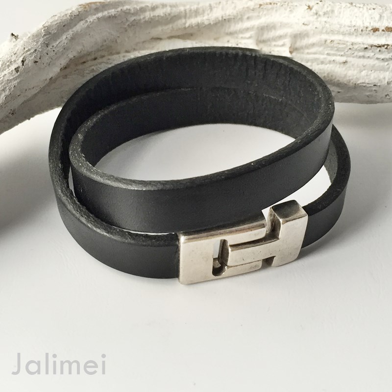 Wickelarmband für den Herren aus glattem, schwarzen Leder (ca. 3 mm dick und 13 mm breit). Es wird doppelt um das Handgelenk gewickelt mit einem Magnetverschluß aus Feinzinkguß geschlossen.