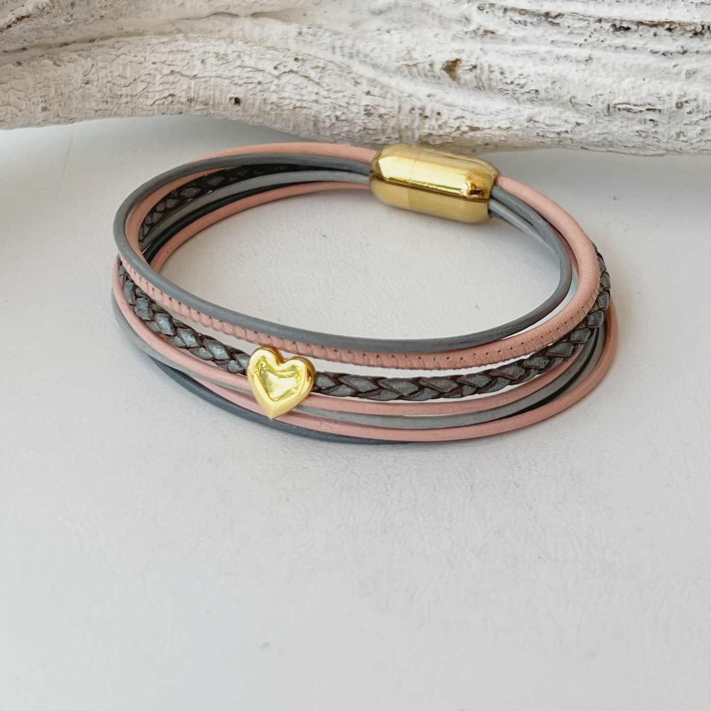 Verarbeitet ist ein geflochtenes Lederband (ca. 2,5 mm) und stahlgrau, ein gesäumtes Nappalederband (ca. 2,5 mm) in zartem Rosa sowie 5 farblich dazu abgestimmte Lederbänder mit einer Stärke von ca. 1,5 mm. Aufgepeppt ist das Armband mit einem kleinen vergoldetem Metallschieber Herz (ca. 8 mm), durch das einige Bänder zusammenfasst sind.