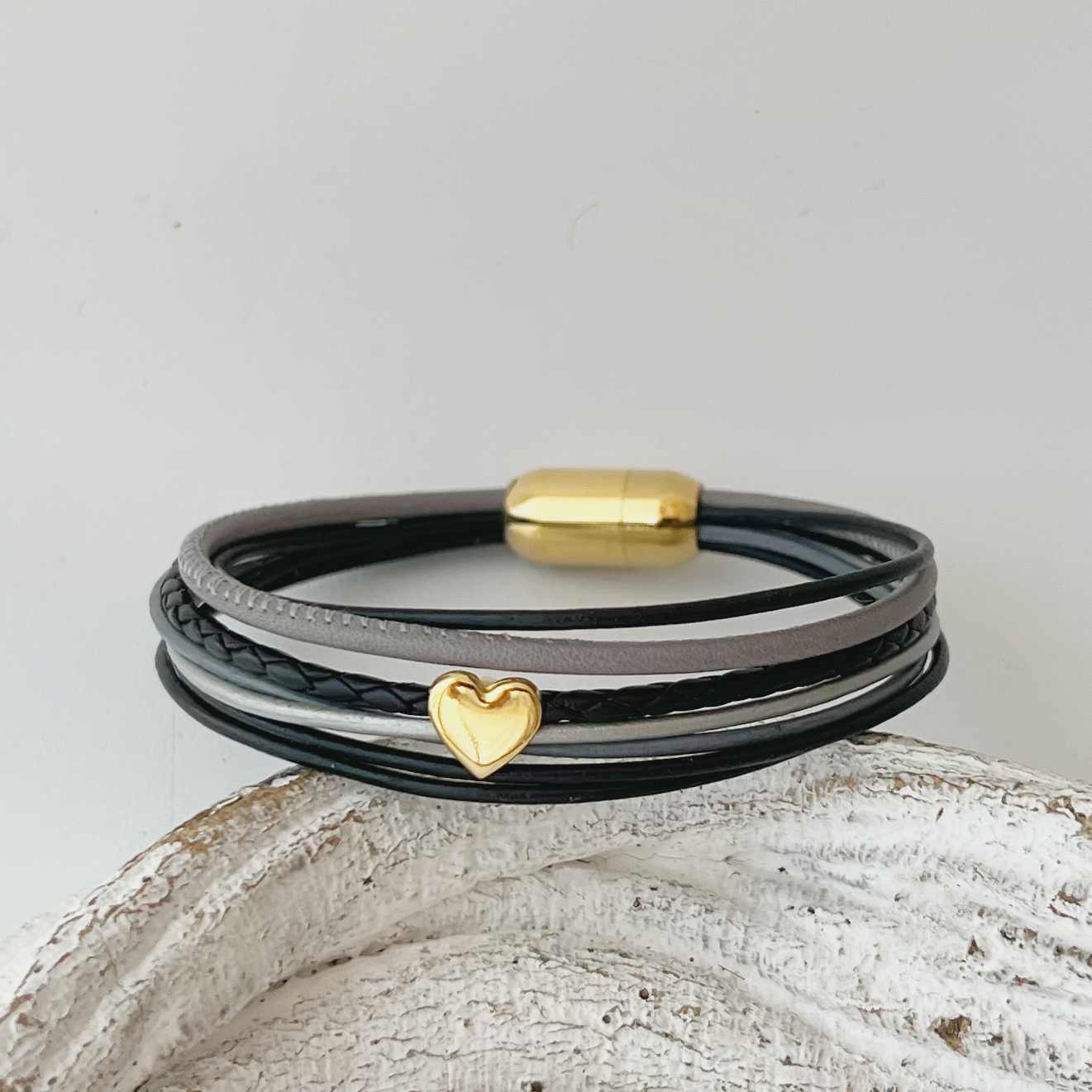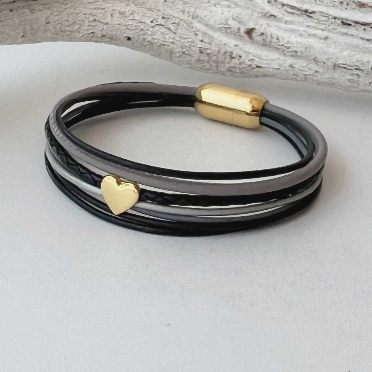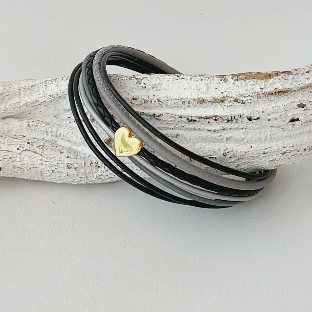 Verarbeitet ist ein schwarzes geflochtenes Lederband (ca. 2,5 mm), ein gesäumtes Nappalederband (ca. 2,5 mm) in hellgrau sowie 5 farblich dazu abgestimmte Lederbänder mit einer Stärke von ca. 1,5 mm. Aufgepeppt ist das Armband mit einem kleinen vergoldetem Metallschieber Herz (ca. 8 mm), durch das einige Bänder zusammenfasst sind.