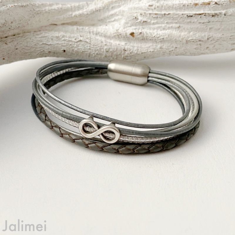 Das schöne Lederarmband Infinity grau ist ein echtes Lieblingsstück! Die schlichten Grau- und Silbertöne der verwendeten Lederbänder passen zu vielen Outfits. Das kleine Infinityzeichen peppt das Armband auf. Das Lederarmband Infinity grau lässt sich mit Hilfe eines hochwertigen Edelstahl-Magnetverschlusses leicht an- und ablegen.