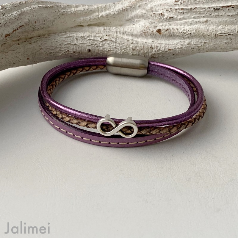 Die Farbe Lila ist in diesem Herbst wieder stark im Kommen und dazu passt super das schöne Lederarmband Infinity lila! Es besteht aus einem ca. 5 mm breiten Lederband mit mittiger Naht sowie einem geflochtenen Lederband (ca. 2,5 mm) in der Farbe antikgrau und einem Nappalederband (ca. 2,5) in einem schönen Lilametallic. Aufgepeppt ist das Armband mit einer kleinen Metall Infinityzeichen.