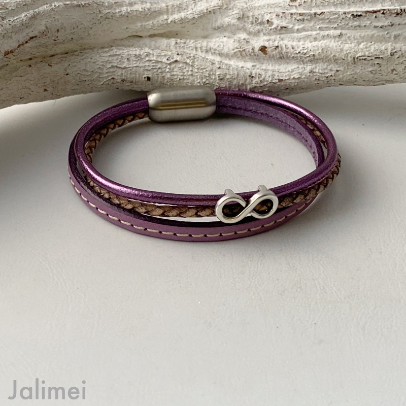 Das Lederarmband Infinity lila lässt sich mit Hilfe eines hochwertigen Edelstahl-Magnetverschlusses leicht an- und ablegen.