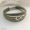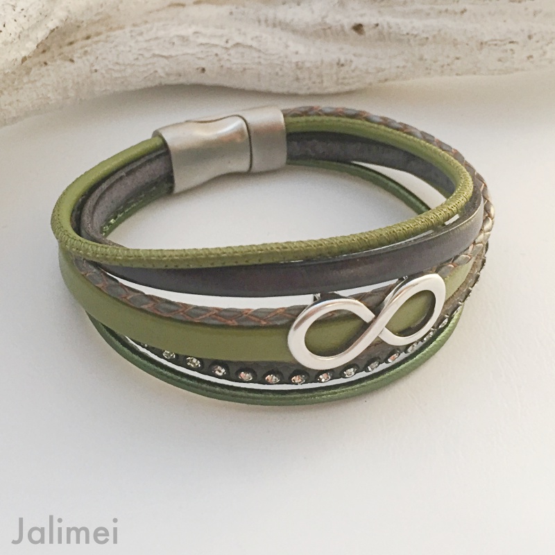 Schönes Armband bestehend aus 6 verschiedenen Lederbändern in dunkelgrau/Antrazith und olivgrün. Ein besonderer Hingucker ist das mit Swarovskisteinen besetzte Lederband. Aufgepeppt ist es mit einem Metallschieber Infinity und wird mit einem hochwertigen Edelstahl-Magnetverschluß geschlossen.