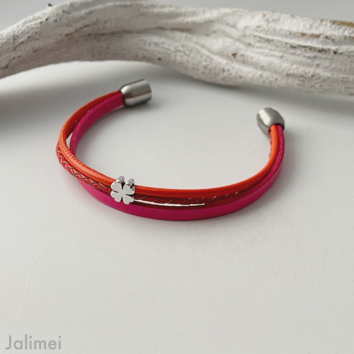 In dem Armband sind verschiedene Bänder verarbeitet: ein flaches Lederband (ca. 5 mm) in einem knalligen Pink, ein rotes geflochtenes Lederband (ca. 2,5 mm) sowie ein Nappalederband (ca. 2,5 mm) in leuchtendem orange. Aufgepeppt ist das Armband mit dem kleinen Metallelement Kleeblatt, das die beiden dünneren Bänder zusammenhält.