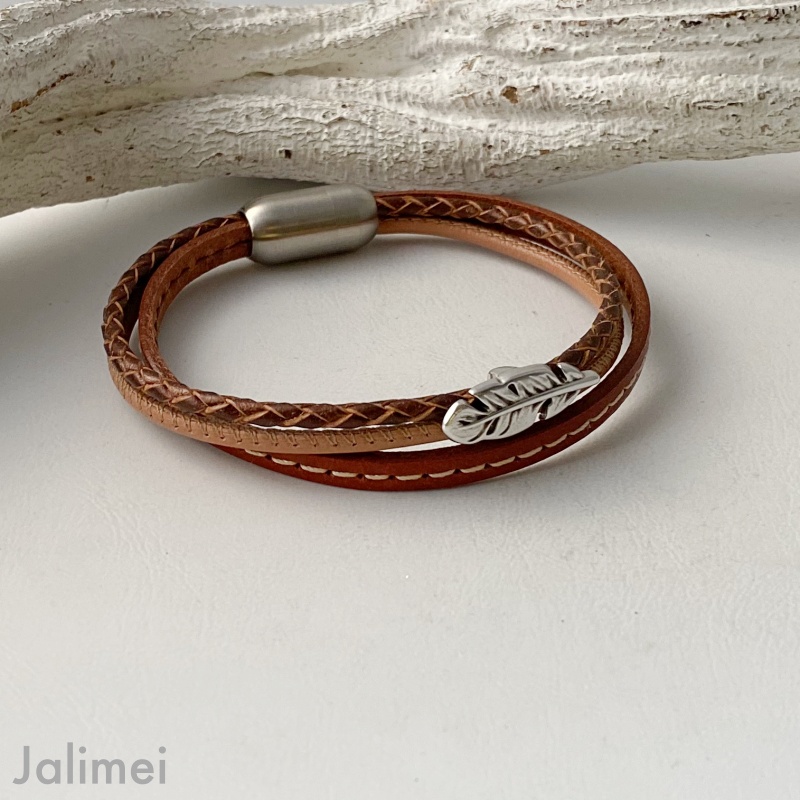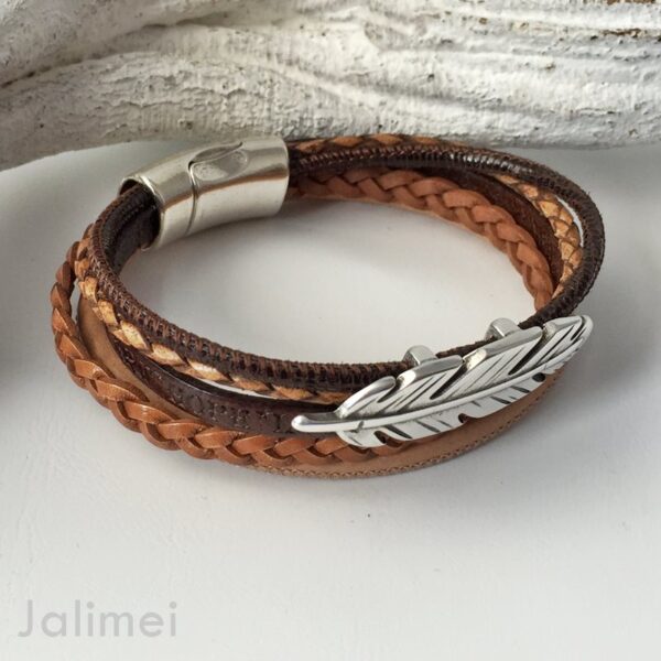 Das Lederarmband kleine Feder braun ist aus echten Lederbändern in verschiedenen Brauntönen gefertigt. Es besteht aus einem ca. 5 mm breiten Lederband mit mittiger Naht sowie einem geflochtenen Lederband (ca. 2,5 mm) und einem Nappalederband (ca. 2,5). Aufgepeppt ist das Armband mit einer kleinen Metallfeder.