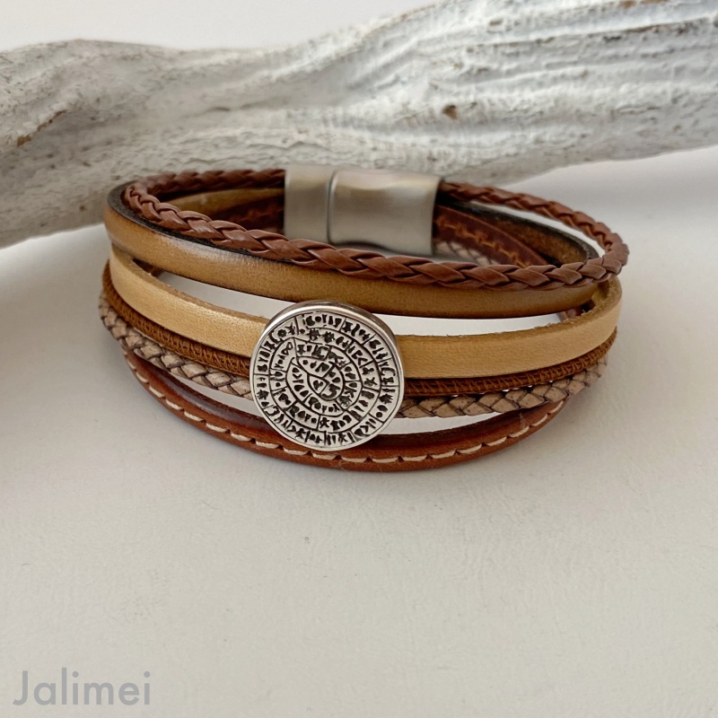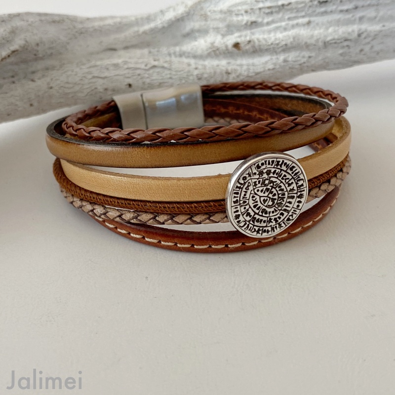 Das Lederarmband kleine Phaistos Scheibe beige-braun ist in schlichten Farben gehalten. Es sind 5 verschiedene echte Lederbänder verarbeitet. Das Metallelement (ca. 18 mm Durchmesser) ist der bekannten Phaistos Scheibe nachgebildet. Hierbei handelt es sich um eine auf Kreta gefundene Tonscheibe aus der Bronzezeit mit einer besonderen Stempeltechnik. Das Lederarmband mit kleiner Phaistos Scheibe beige-braun ist mit einem hochwertigen Edelstahlmagnetverschluß ausgestattet. Darum lässt es sich leicht an- und ablegen.