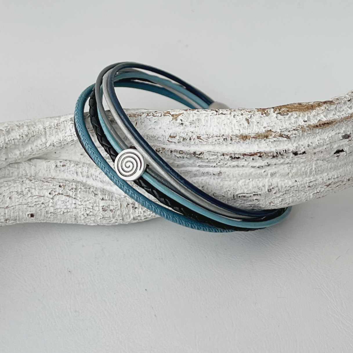 Verarbeitet sind ein Nappalederband (ca. 2,5 mm) in rauchblau, ein schwarzes geflochtenes Lederband (ca. 2,5 mm) und 5 dazu farblich abgestimmte Lederbänder (je ca. 1,5 mm). Aufgepeppt ist das Armband mit einer kleinen Spirale (ca. 8 mm), das einige Bänder zusammenfasst.