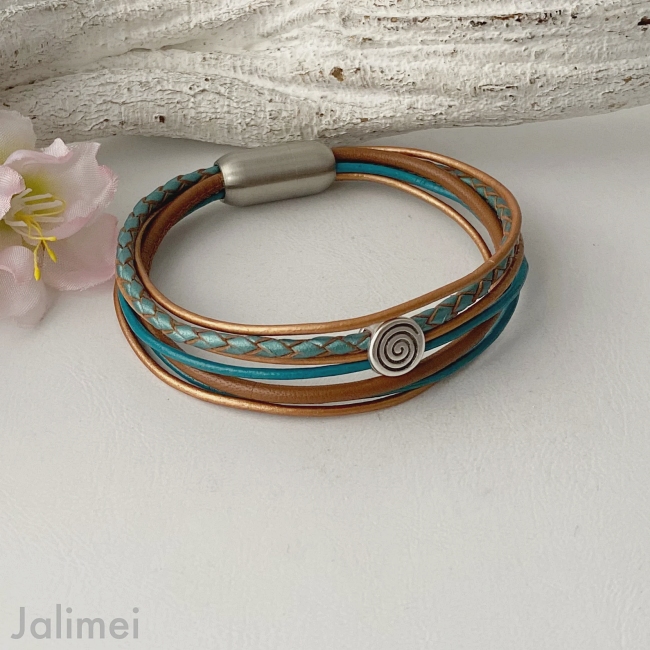 Verarbeitet sind braunes Nappalederband (ca. 2,5 mm), ein geflochtenes Lederband (ca. 2,5 mm) in petrol und 5 dazu farblich abgestimmte Lederbänder (je ca. 1,5 mm). Aufgepeppt ist das Armband mit einer kleinen Spirale (ca. 8 mm), das einige Bänder zusammenfasst.